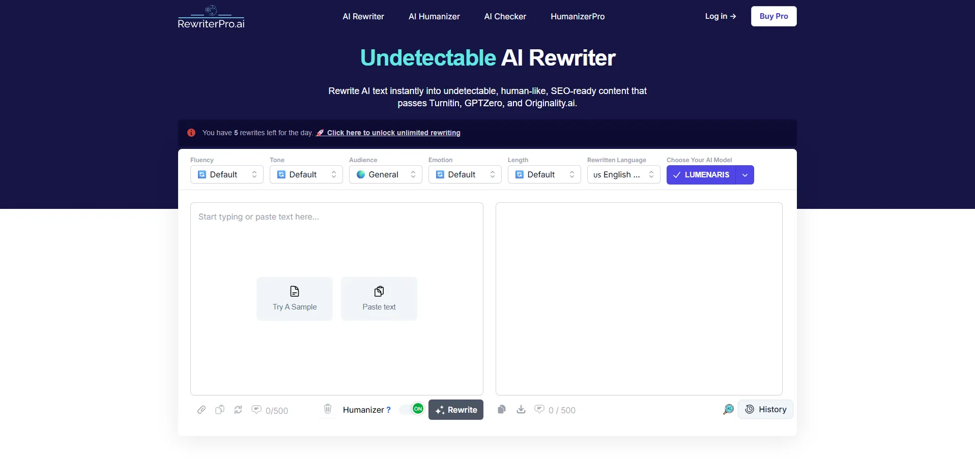 RewriterPro es una herramienta gratuita de IA que humaniza y mejora el contenido generado con inteligencia artificial. Mediante procesamiento avanzado de lenguaje natural, transforma textos automáticos en redacciones auténticamente humanas, sin plagio y con calidad profesional. Ofrece hasta 15 reescrituras diarias en su versión gratuita y permite actualizarse a un plan ilimitado para eliminar restricciones. Con funciones de personalización de tono, fluidez, emoción, especificidad y extensión, garantiza resultados adaptados a distintos estilos y necesidades de escritura.