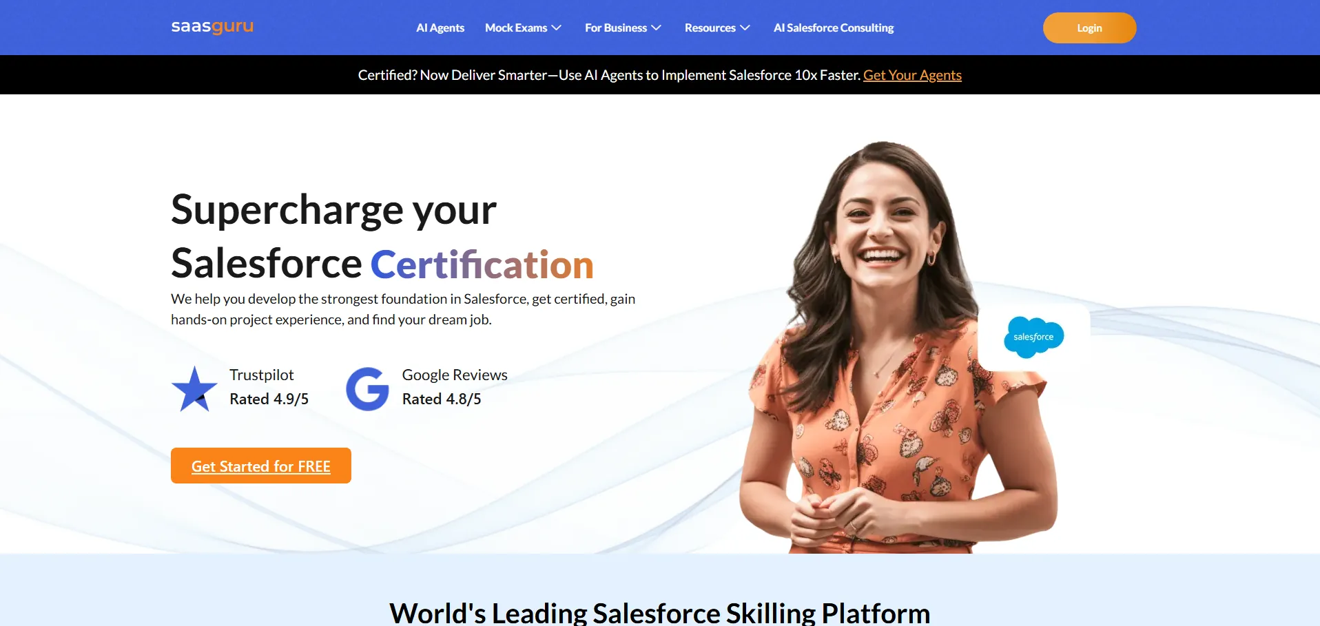 SaasGuru es una plataforma líder impulsada por IA que facilita el desarrollo de habilidades y la certificación en Salesforce. Mediante bootcamps intensivos, cursos de preparación para el examen a tu propio ritmo y clases en vivo con expertos globales, permite obtener la certificación en apenas dos semanas con una tasa de aprobación del 98,7 %. Incluye proyectos finales, práctica de entrevistas, sesiones ilimitadas de resolución de dudas, apoyo comunitario y un asistente de aprendizaje personal basado en IA que guía tu progreso y conecta a los estudiantes con posibles empleadores.