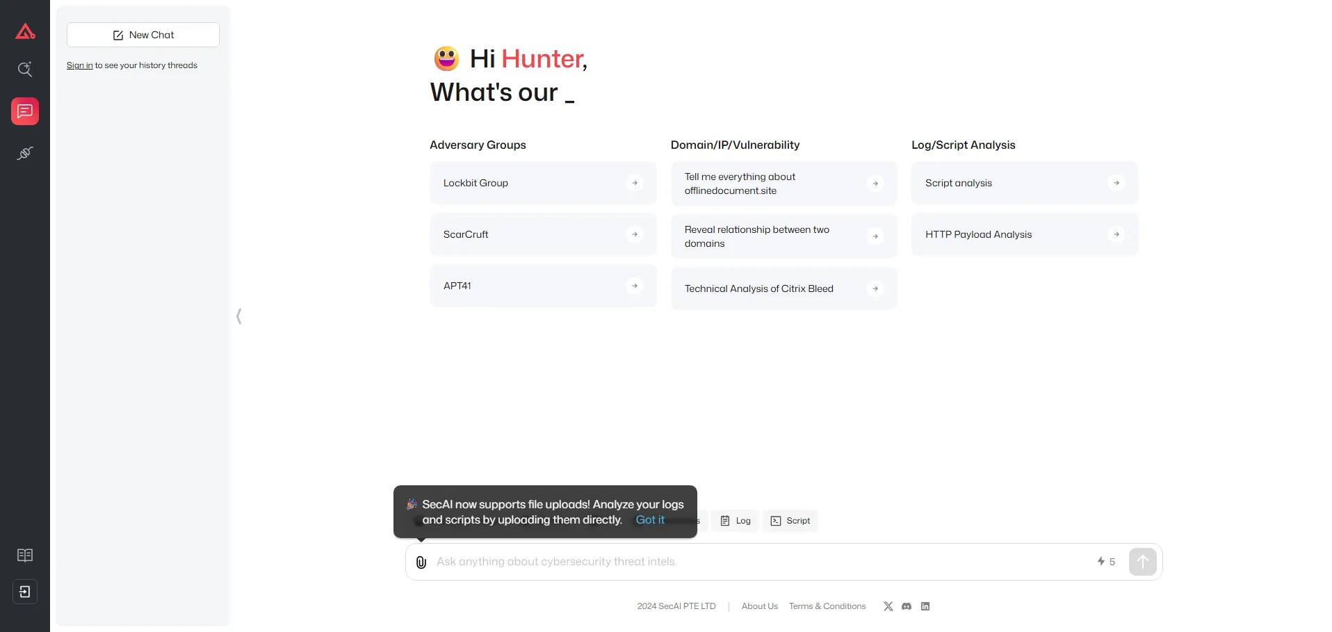 SecAI es una plataforma de inteligencia de amenazas basada en IA, diseñada para el análisis de ciberseguridad y la respuesta a incidentes. Permite investigar de forma interactiva las relaciones entre grupos adversarios como LockBit o ScarCruft, realizar análisis técnicos de dominios, IP y vulnerabilidades, y evaluar registros y scripts. Además, ofrece carga directa de documentos para auditorías exhaustivas y mantiene un historial de chat completo para mejorar la trazabilidad de investigaciones y comprender mejor las amenazas.