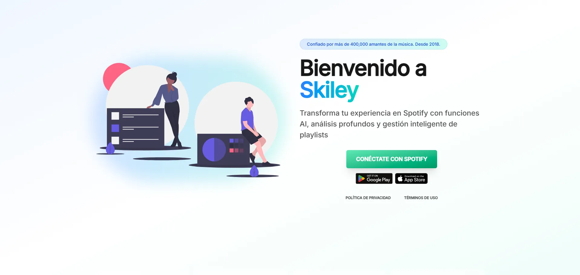 Skiley es una aplicación web que potencia tu experiencia musical en Spotify. Conecta tu cuenta para gestionar y organizar tu biblioteca, crear listas de reproducción personalizadas con IA y descubrir nuevas canciones según tus gustos. Ofrece análisis detallados de tus hábitos de escucha, acceso a letras en directo y significados de las canciones, todo en una interfaz intuitiva. Únete a más de 300.000 melómanos y transforma tu forma de explorar la música.