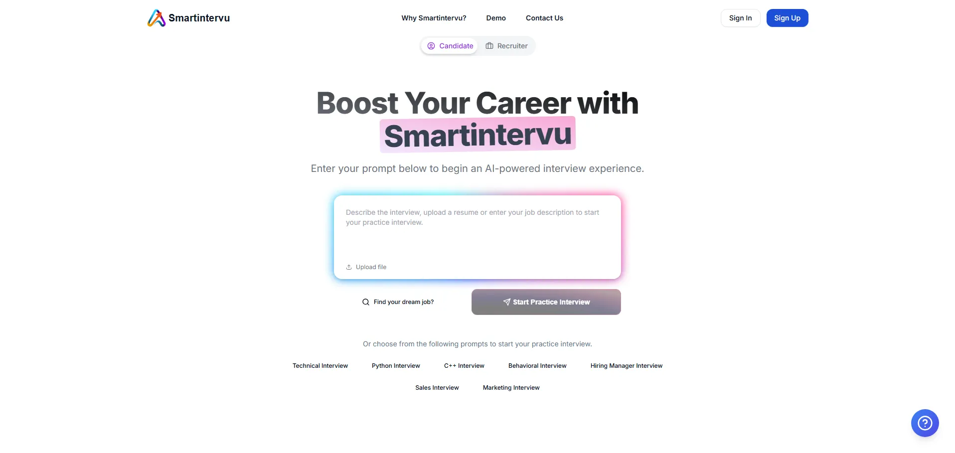 SmartIntervu es una plataforma gratuita de entrevistas impulsada por inteligencia artificial, desarrollada para optimizar y agilizar el proceso de contratación. Permite crear modelos de entrevista personalizados, generar informes detallados sobre el desempeño de los candidatos y adaptar plantillas y tonos de voz para interactuar eficazmente. Gracias a sus paneles inteligentes de métricas, las empresas pueden visualizar resultados en tiempo real y reducir significativamente tiempos y costos asociados a la selección de personal.