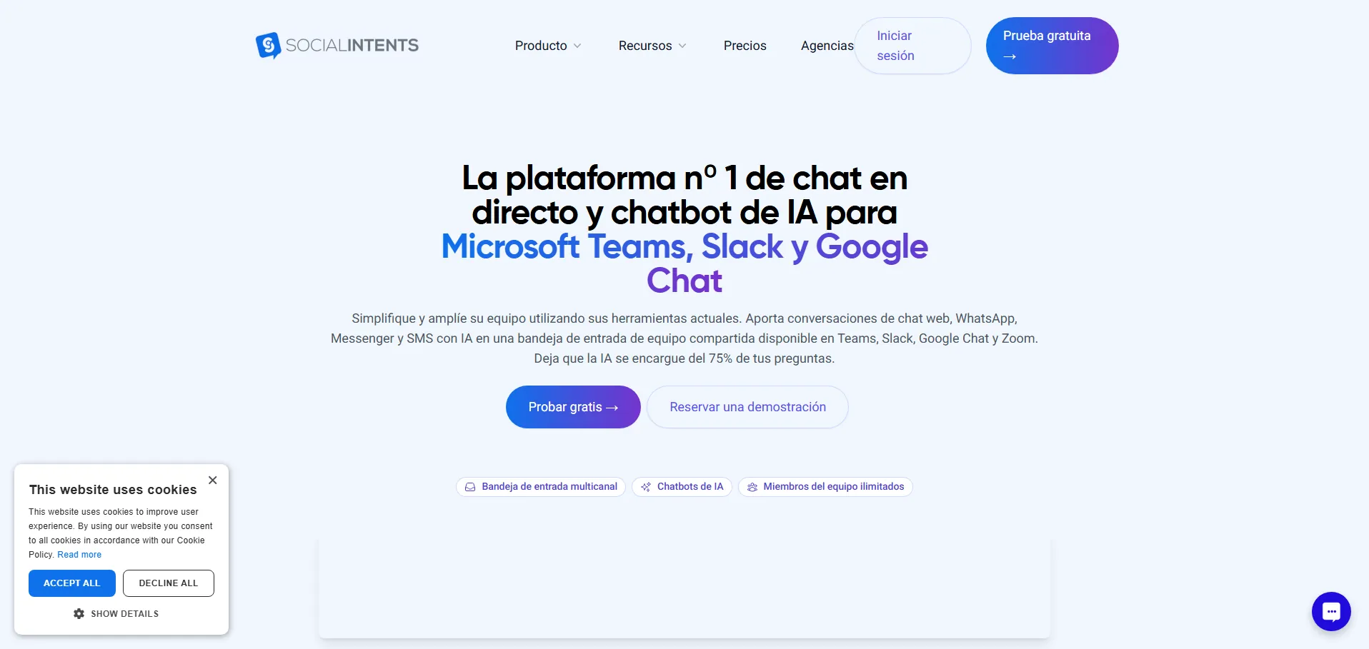 Social Intents es una plataforma de chat en vivo y chatbots con inteligencia artificial que permite a las empresas interactuar directamente con sus visitantes a través de canales como Microsoft Teams, Google Chat y Slack. Ofrece widgets personalizables, encuestas previas al chat e invitaciones proactivas para captar la atención del usuario. Gracias a sus chatbots basados en IA, automatiza respuestas, genera y gestiona clientes potenciales, y facilita el traspaso de conversaciones complejas a agentes humanos. Su integración nativa con sistemas de CRM y de ticketing garantiza flujos de atención al cliente y procesos de ventas más eficientes.