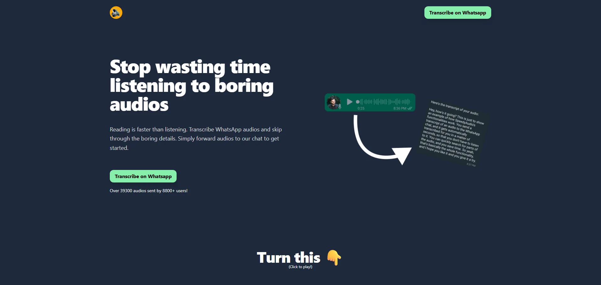 Speedy Audios es una herramienta de transcripción avanzada que convierte mensajes de voz de WhatsApp en texto de forma instantánea. Permite reenviar audios directamente desde el chat para obtener transcripciones precisas, editables y con capacidad de búsqueda. Ideal para situaciones en las que escuchar grabaciones resulta incómodo o imposible, Speedy Audios agiliza el acceso a la información y mejora la productividad al trabajar con mensajes de voz.