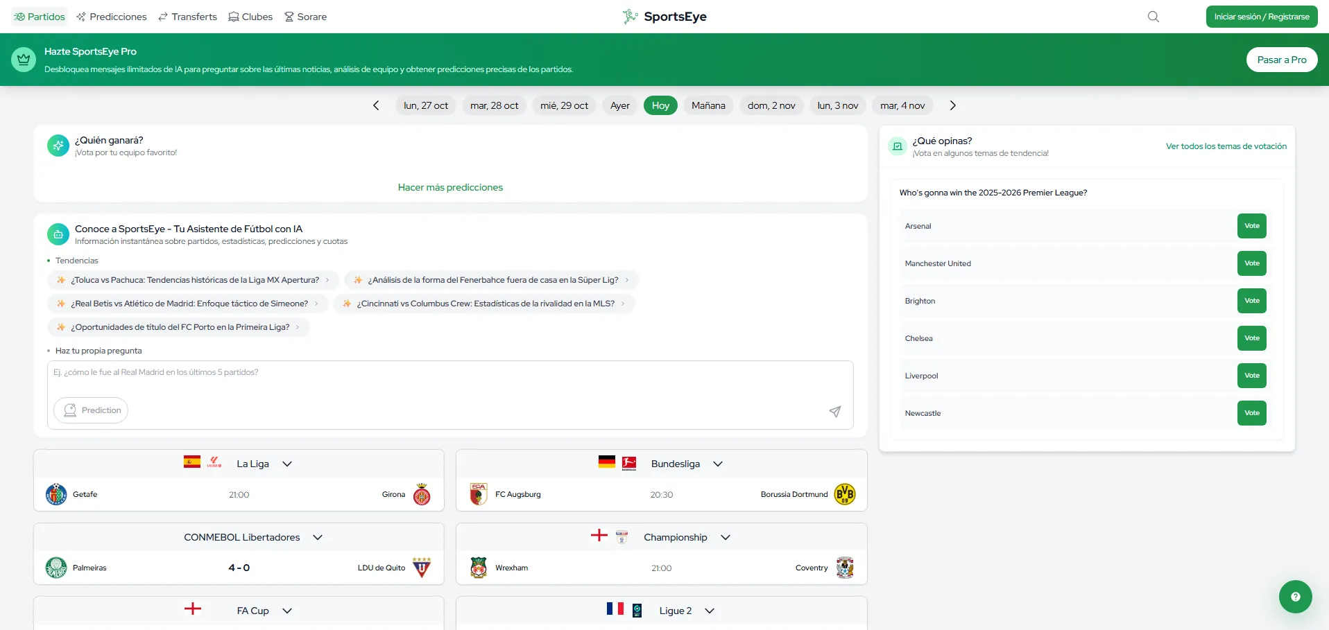 SportsEye es una plataforma de predicciones de fútbol impulsada por inteligencia artificial y datos en tiempo real. Ofrece a aficionados, analistas y jugadores de fantasy un panel integral con noticias al instante, fichajes actualizados y estadísticas detalladas de clubes y jugadores. Su modelo de lenguaje especializado en fútbol minimiza imprecisiones y genera pronósticos personalizados. Además, permite importar colecciones de Sorare y combinar métricas de fantasy football para optimizar estrategias de juego.