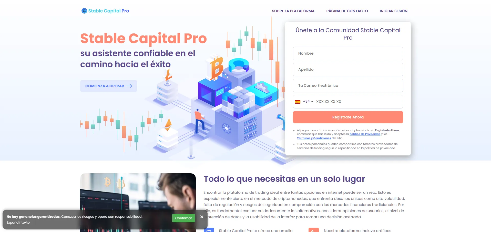 Stable Capital Pro es una plataforma de trading impulsada por inteligencia artificial que automatiza y optimiza operaciones en criptomonedas, forex, acciones y materias primas. Emplea algoritmos avanzados para analizar datos de mercado en tiempo real y ejecutar estrategias según tus niveles de riesgo y preferencias. Su interfaz intuitiva permite personalizar gráficos y herramientas analíticas, facilitando la diversificación de la cartera sin necesidad de supervisión constante. Ofrece una cuenta demo gratuita para practicar y una cuenta real con depósito mínimo de $250. Todas las transacciones cuentan con cifrado robusto y certificados SSL, y el soporte está disponible 24/7 vía correo electrónico y chat en vivo.