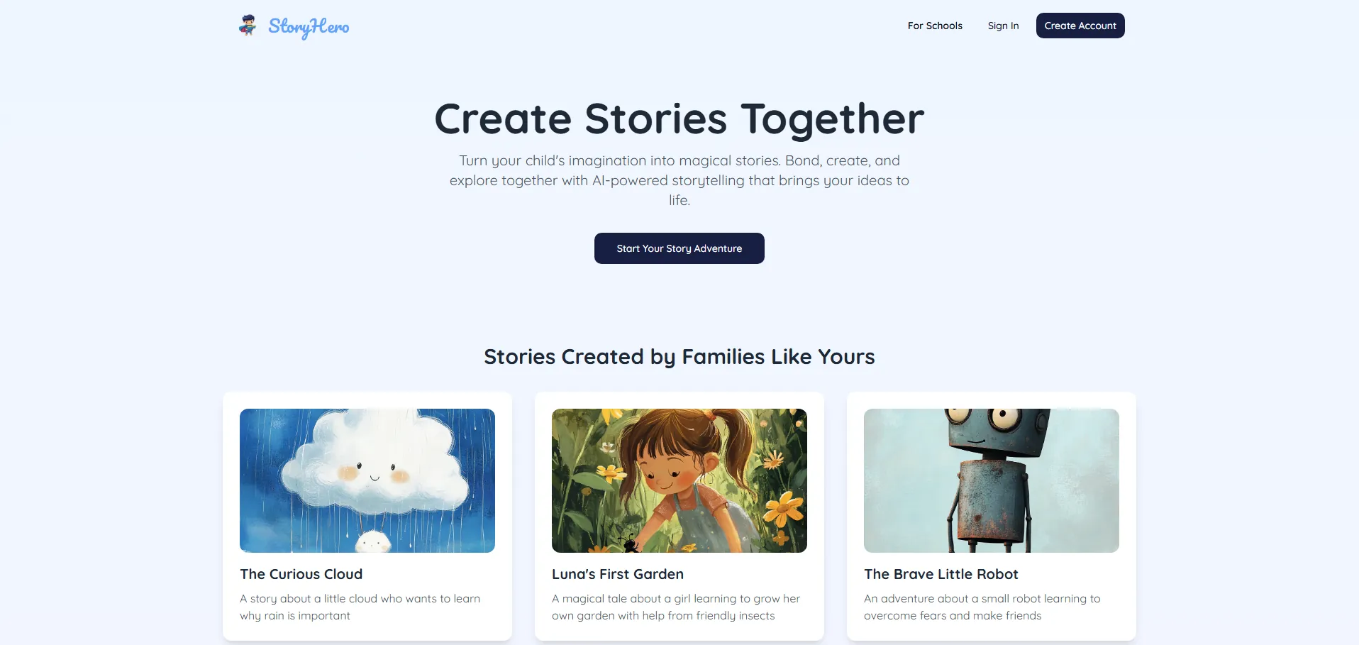 StoryHero es una plataforma de narración con IA pionera que funciona como un creador de cuentos infantiles y herramienta de narración colaborativa. Diseñada para estimular la imaginación y fortalecer vínculos familiares, permite a padres, educadores y niños generar historias interactivas en varios idiomas (inglés, sueco, noruego, alemán y danés). Con generación de historias con IA, StoryHero convierte cada sesión de lectura en una experiencia educativa que potencia habilidades lingüísticas y la inteligencia emocional, además de ofrecer una biblioteca dinámica de contenido generado por usuarios para inspirar nuevas aventuras narrativas.