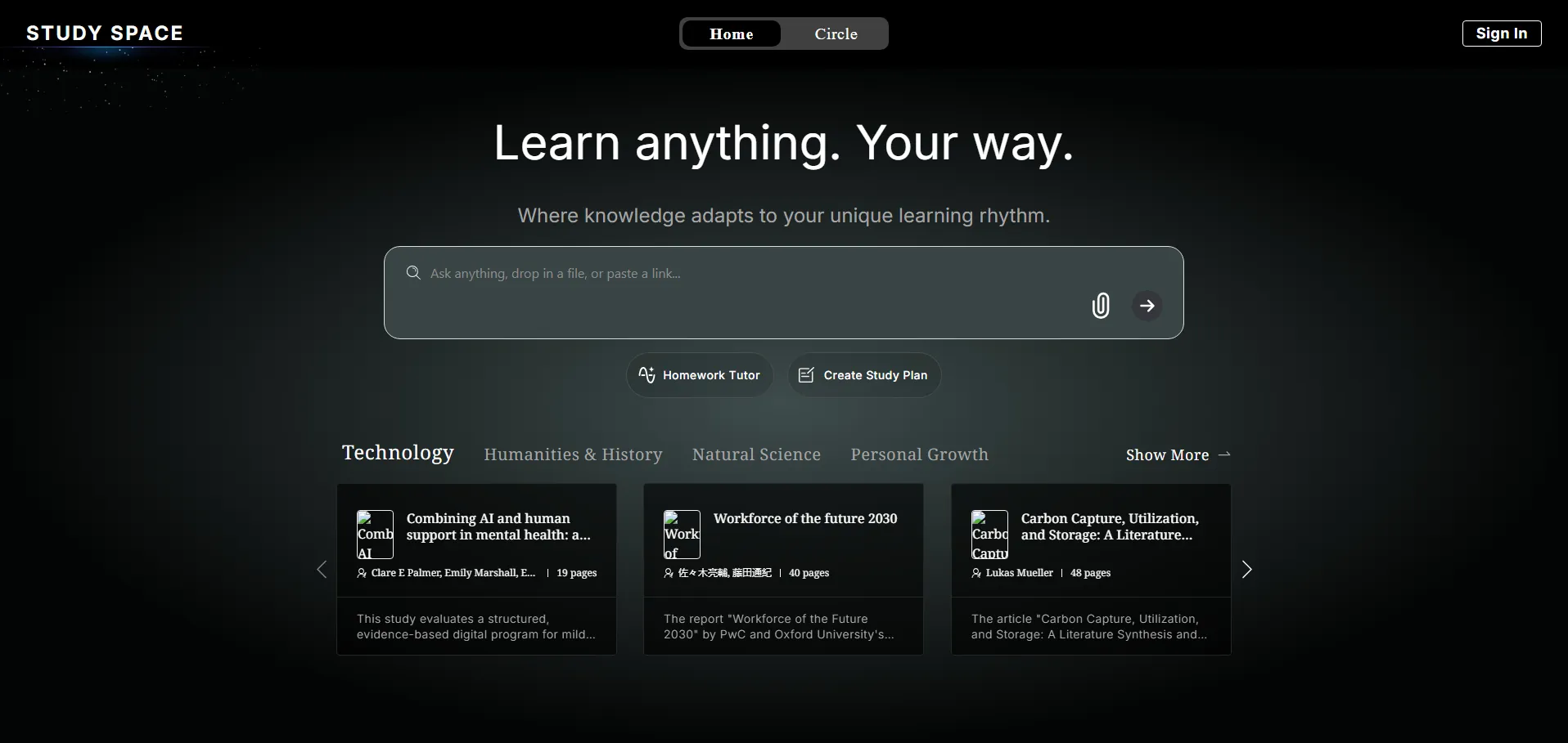 Study Space es una plataforma que transforma la forma de acceder y asimilar el conocimiento, convirtiendo cualquier documento o enlace en un curso multimodal inmersivo con diapositivas dinámicas, narración de voz con IA y animaciones. Permite seguir el texto original, reforzar la comprensión mediante preguntas y respuestas interactivas y desglosar información compleja en formatos atractivos, todo sin necesidad de experiencia previa.