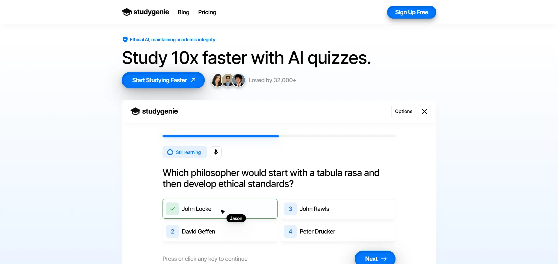 StudyGenie es una plataforma de estudio potenciada por inteligencia artificial que maximiza la productividad del aprendizaje. Permite importar apuntes o crear nuevos contenidos desde cero, generando cuestionarios interactivos y tarjetas de estudio en un solo clic. Con explicaciones detalladas de respuestas incorrectas y un sistema de seguimiento de retención, StudyGenie ayuda a los usuarios a ajustar sus horarios y mejorar la memorización, todo ello en una interfaz sencilla que combate la procrastinación.
