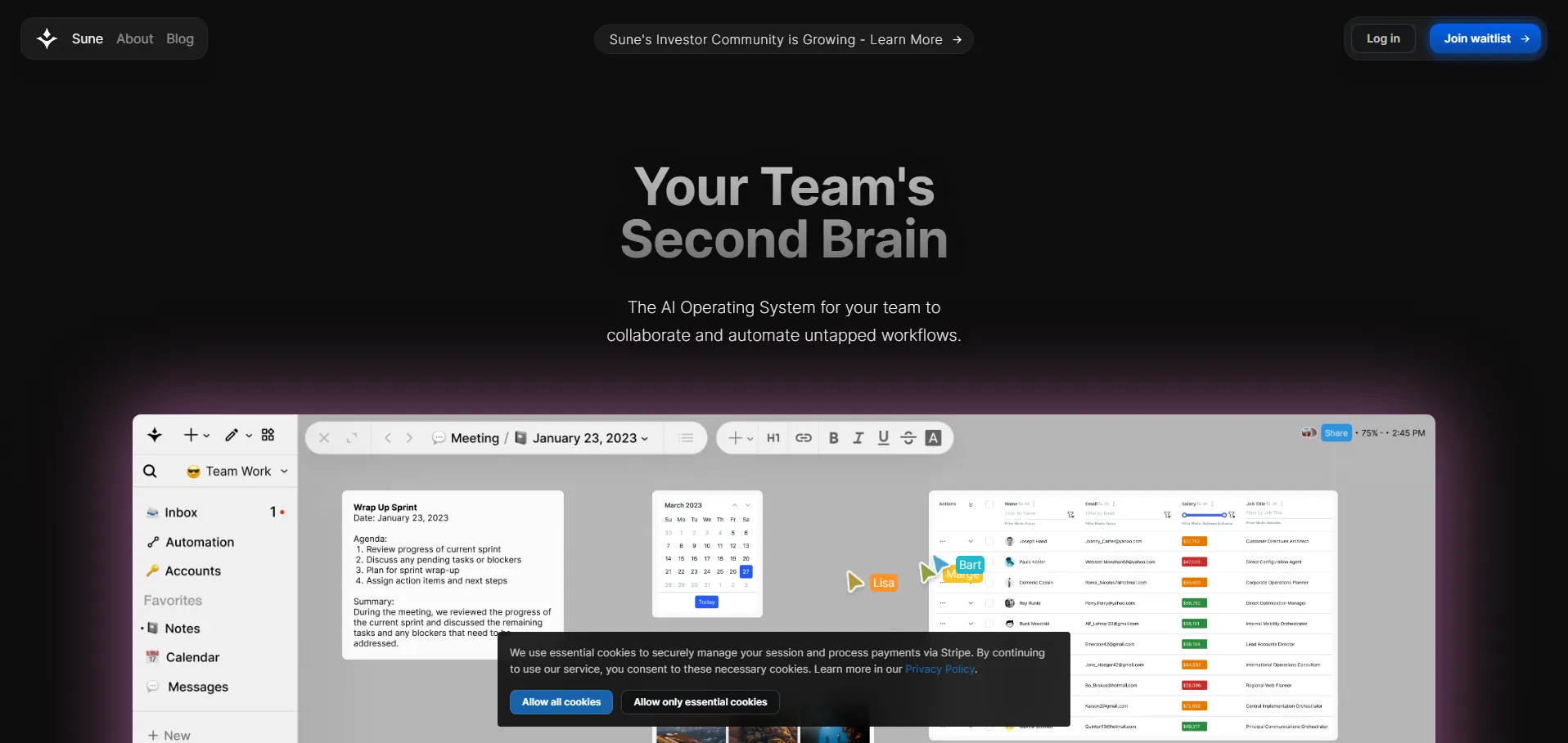 Sune AI es un sistema operativo colaborativo de IA que centraliza y automatiza los flujos de trabajo de equipos. Permite crear y gestionar documentos, tableros kanban, calendarios de sprint, moodboards de texto y bocetos en una base de datos unificada. Con integraciones nativas con Notion, Salesforce, Slack, Google y más, y un editor de nodos basado en lenguaje natural, Sune AI acelera la planificación, colaboración y ejecución de proyectos mediante automatizaciones sofisticadas y análisis predictivos.