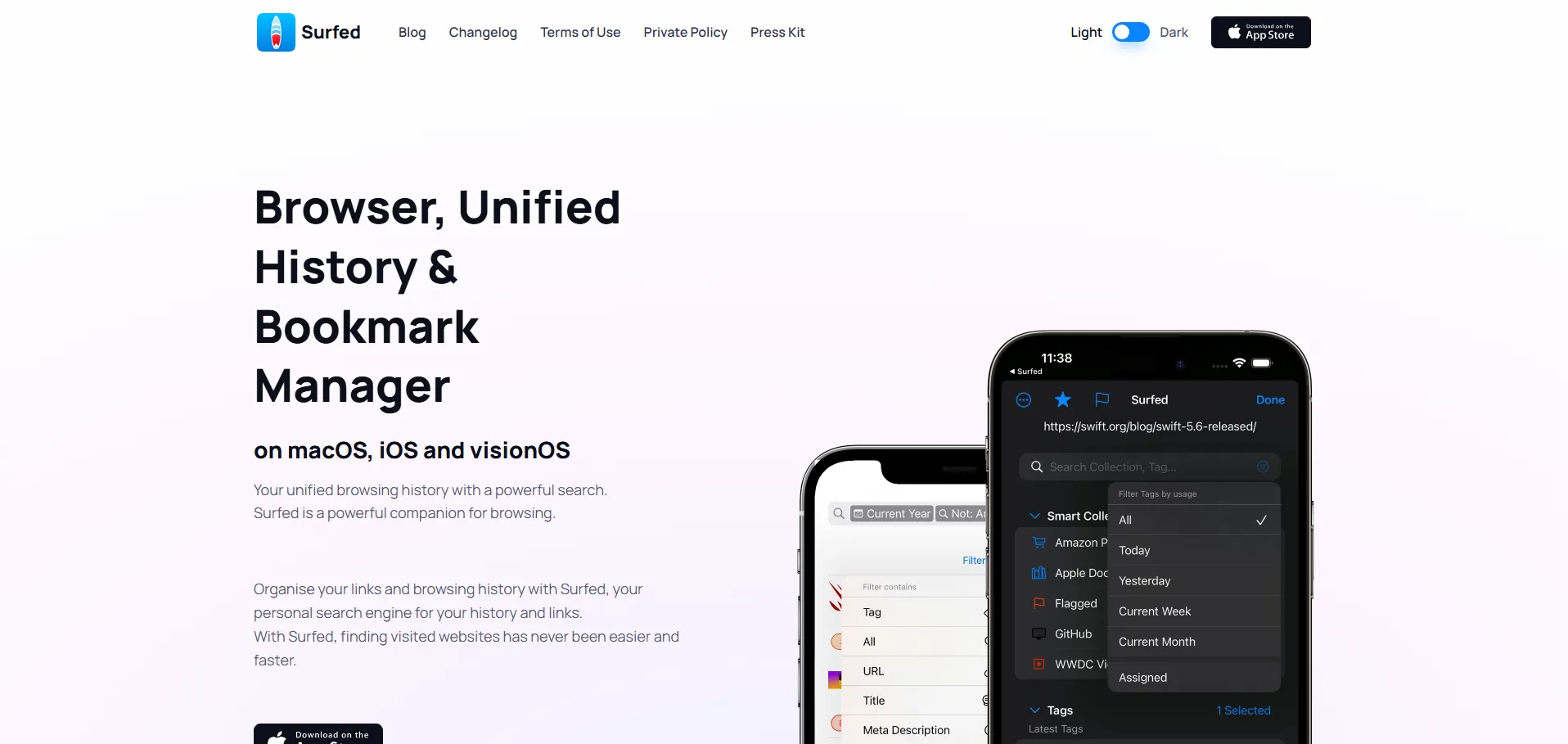 Surfed es un gestor integral de historial y marcadores para macOS, iOS y visionOS. Centraliza el registro de navegación en Safari y Chrome, facilitando volver a páginas anteriores y recuperar contenido con rapidez. Su sistema de etiquetas y colecciones inteligentes permite organizar favoritos de forma intuitiva, mientras que el motor de búsqueda privado garantiza una experiencia segura. Con automatización web, “Escuchar más tarde” y un modo de lectura sin distracciones, Surfed optimiza la productividad. Además, ofrece espacios personalizados para proyectos, estadísticas de uso y atajos de teclado para un acceso ultrarrápido.