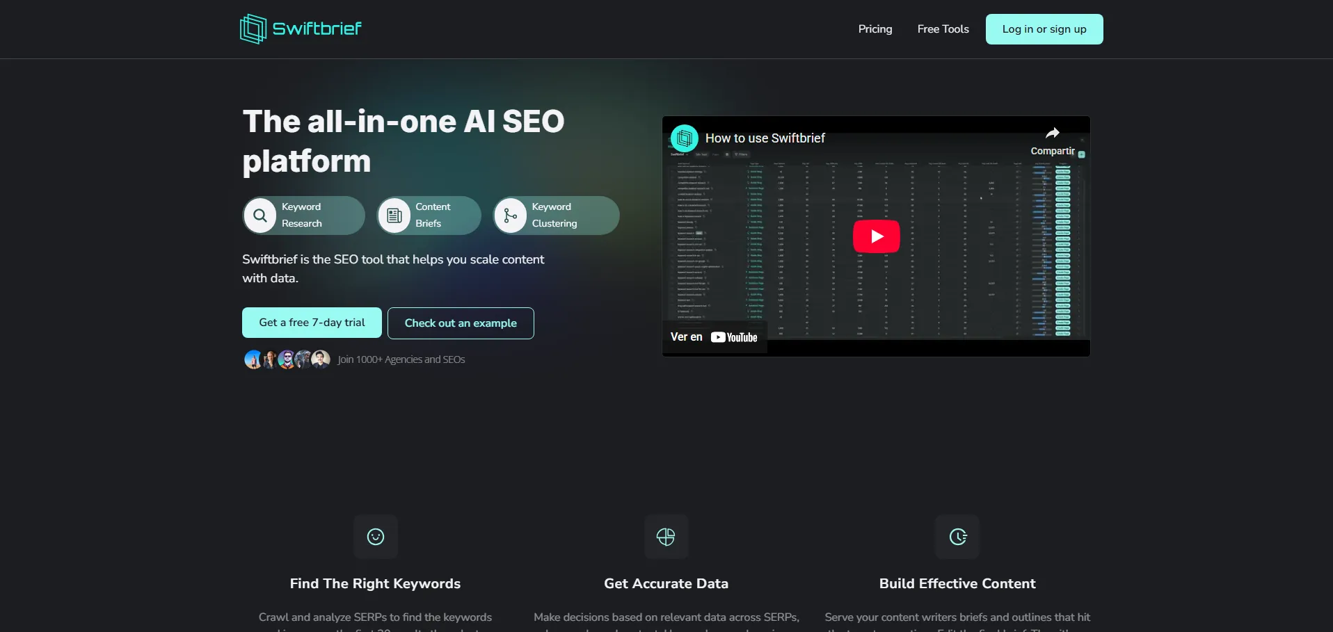 Swiftbrief es una plataforma SEO con IA todo en uno que centraliza la investigación de palabras clave, la creación de briefings de contenido y la agrupación semántica para optimizar estrategias y mejorar la visibilidad en buscadores. Incorpora análisis de la competencia y un generador de esquemas de blog que acelera el flujo de trabajo de profesionales del marketing y redactores, garantizando contenidos alineados con la intención del usuario.