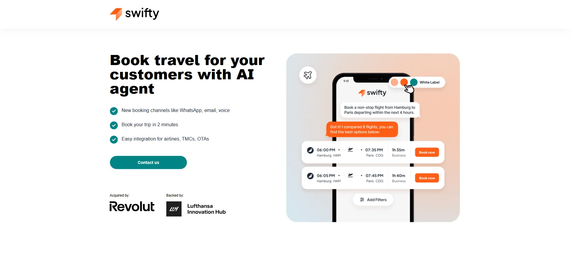 Swifty es un asistente de viajes de negocios impulsado por inteligencia artificial que simplifica cada etapa de la planificación corporativa. Mediante un chat conversacional, permite reservar vuelos y hoteles en tiempo real, centraliza confirmaciones y facturas, ofrece alertas automáticas de cambios de vuelo y responde a cualquier consulta sobre tu itinerario, reduciendo la organización de un viaje de negocios a tan solo 5 minutos.