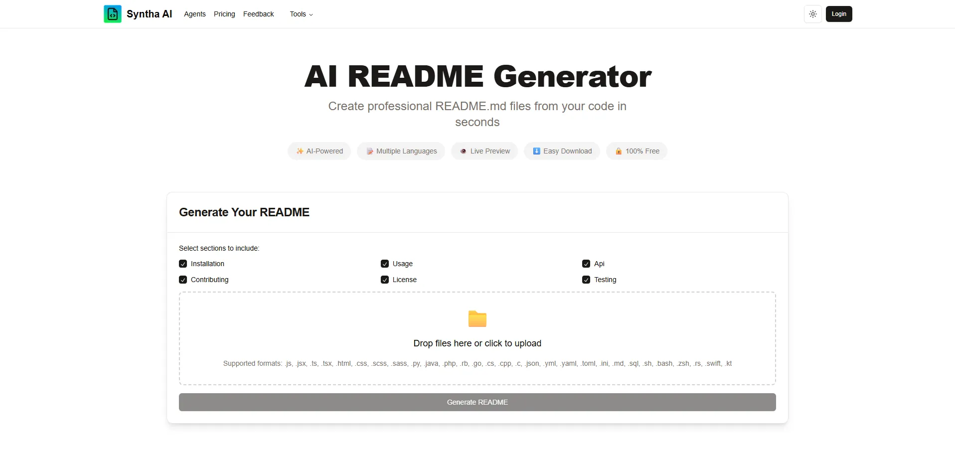 Generador README de Syntha es una herramienta basada en inteligencia artificial que automatiza la creación de archivos README.md profesionales para proyectos de desarrollo. Compatible con JavaScript, Python, HTML y otros lenguajes, esta solución formatea la documentación de forma coherente y precisa. Permite arrastrar y soltar archivos para generar contenido automáticamente, ofrece vista previa en vivo para revisar cambios en tiempo real y brinda opciones de personalización para incluir secciones clave como instrucciones de instalación o detalles de la API. Con Syntha, se reduce drásticamente el tiempo dedicado a la elaboración manual de README y se mejora la visibilidad y calidad de los repositorios en plataformas colaborativas.