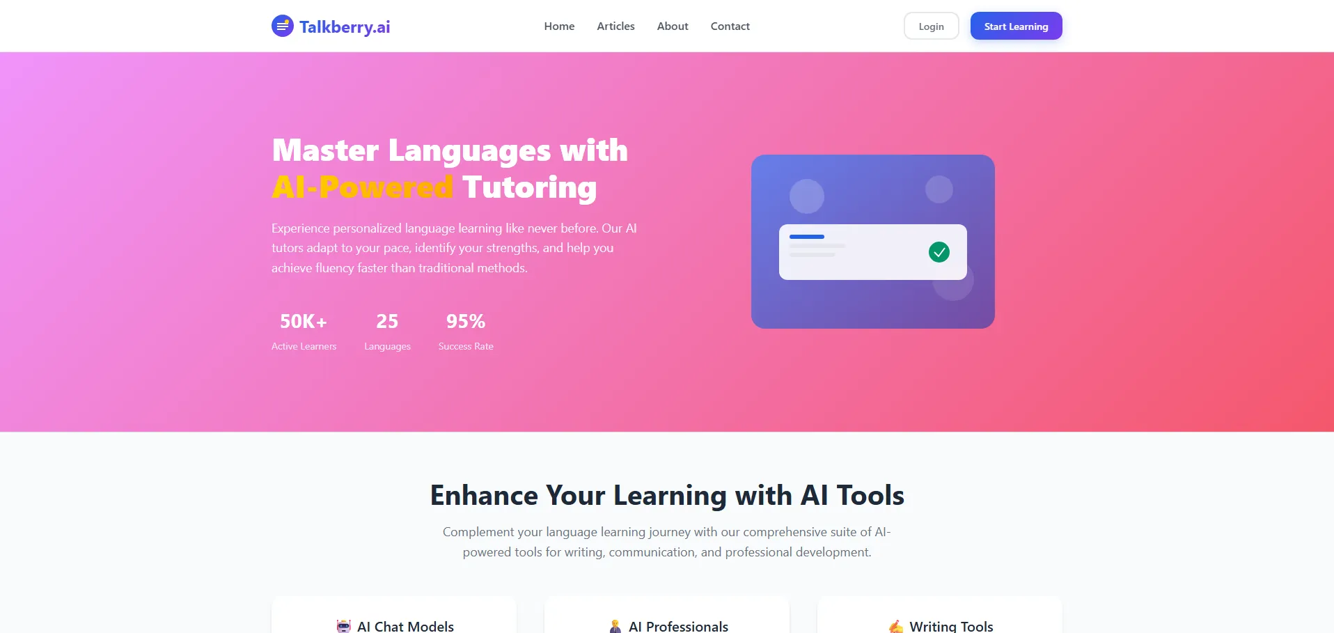 TalkBerry es una plataforma de inteligencia artificial diseñada para perfeccionar tu inglés y preparar entrevistas de trabajo de forma realista. Mediante un simulador de entrevistas con un entrevistador virtual impulsado por ChatGPT, permite practicar respuestas, recibir feedback instantáneo y recomendaciones personalizadas. Analiza tus fortalezas y áreas de mejora, ofrece conversaciones de voz profesionales y está disponible 24/7 desde cualquier dispositivo, elevando tu confianza y éxito en procesos de selección.