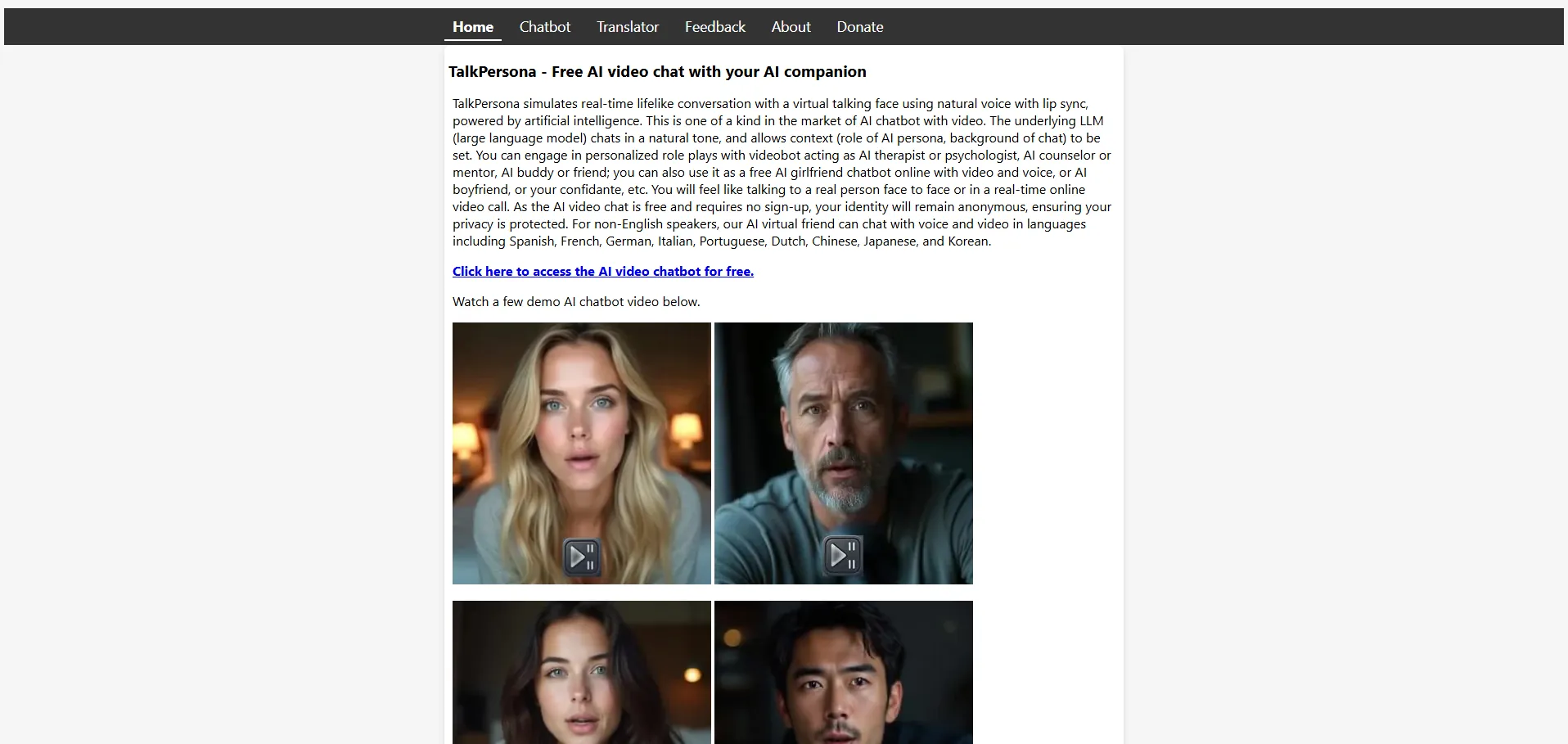 TalkPersona es un chatbot de video con IA gratuito que permite mantener conversaciones en tiempo real con un rostro virtual y tecnología de sincronización labial. Gracias a un modelo de lenguaje amplio (LLM) avanzado, ofrece diálogos contextuales en distintos roles—como terapeuta, consejero o acompañante—y es compatible con varios idiomas, incluyendo español, francés y mandarín. Los usuarios disfrutan de interacciones personalizadas en formato de video cara a cara, creando una experiencia de conversación auténtica y envolvente.