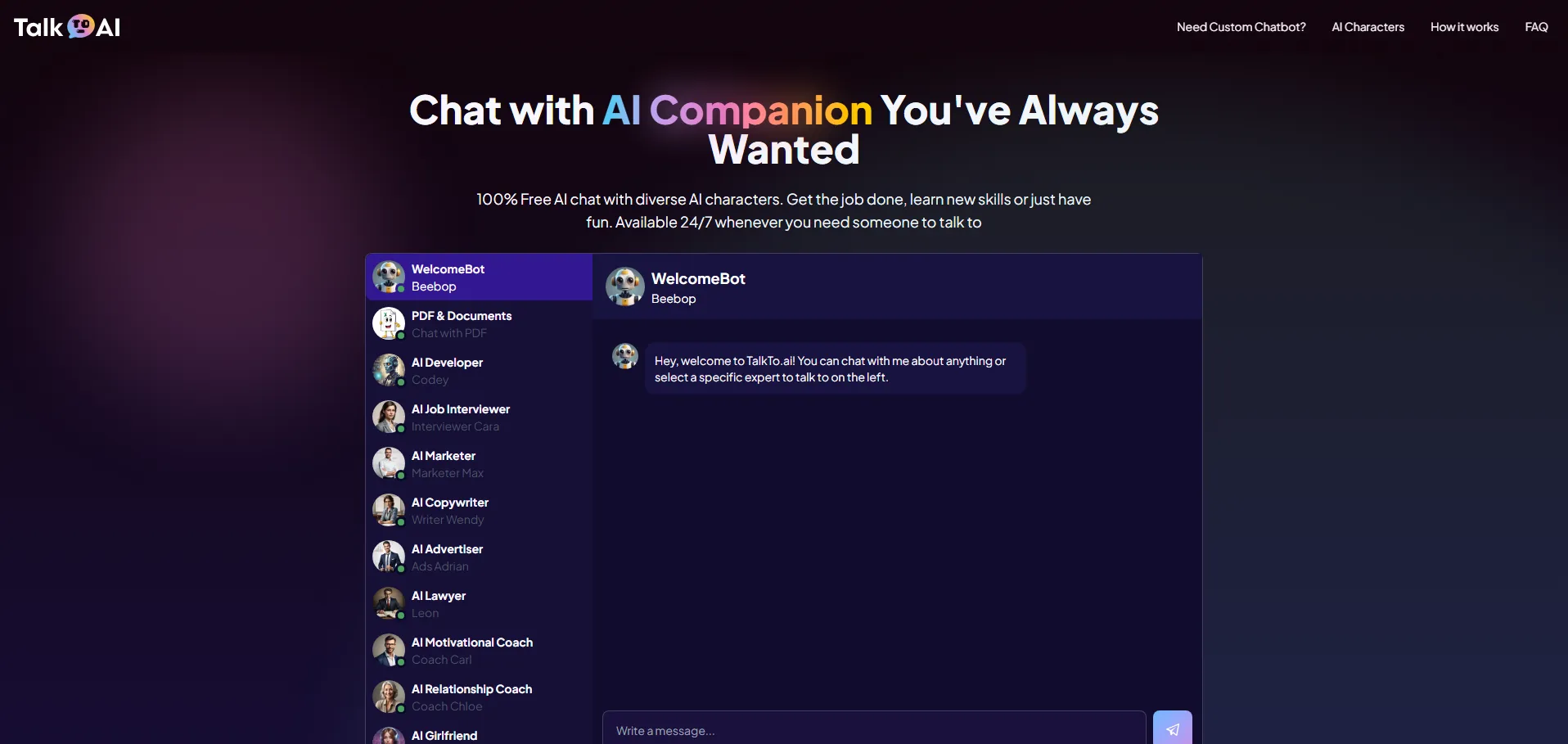 TalkTo AI es una plataforma de inteligencia artificial que permite a los usuarios mantener conversaciones dinámicas con una amplia variedad de personajes virtuales. Desde profesores y desarrolladores hasta coaches motivacionales y novelistas, ofrece chatbots especializados que se adaptan a diferentes temas, emociones y necesidades.