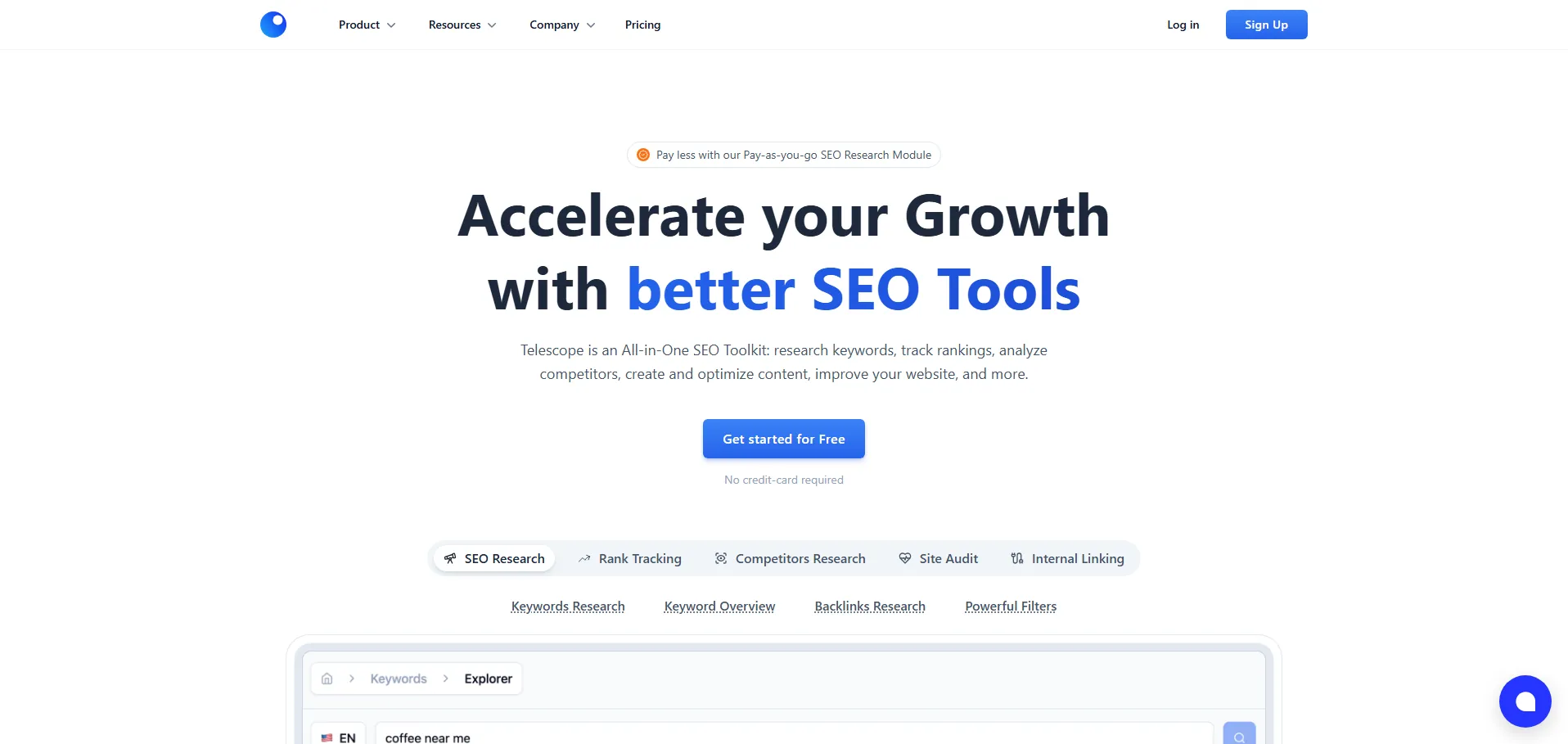 Telescope es un kit de herramientas SEO todo en uno que facilita la optimización de sitios web para motores de búsqueda. Incluye funciones de investigación de palabras clave, seguimiento de posicionamientos, análisis de la competencia y auditorías técnicas, así como herramientas de creación y optimización de contenido e interconexión de enlaces internos. Con potentes filtros y datos detallados, Telescope permite diseñar estrategias de marketing digital sólidas y aumentar la visibilidad online de manera efectiva.