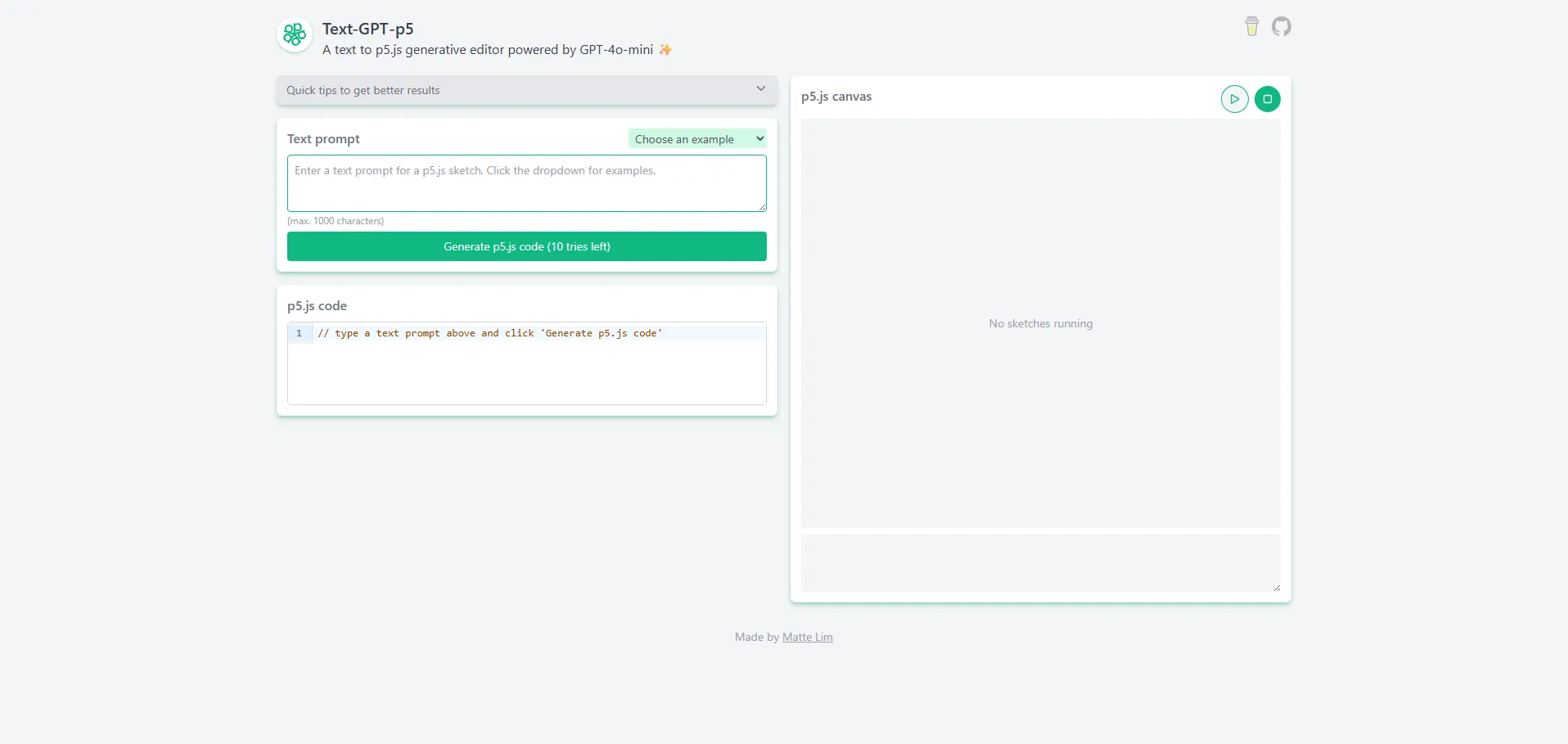 Text-GPT-P5 es un editor generativo basado en IA que agiliza la creación de código p5.js. Permite generar indicaciones de texto para proyectos visuales, como el Juego de la Vida de Conway, animaciones de flocado 2D y formas 3D. Ofrece un límite de 1000 caracteres y 10 intentos por proyecto, facilitando la creación de bocetos interactivos en lienzo de forma rápida y eficiente.
