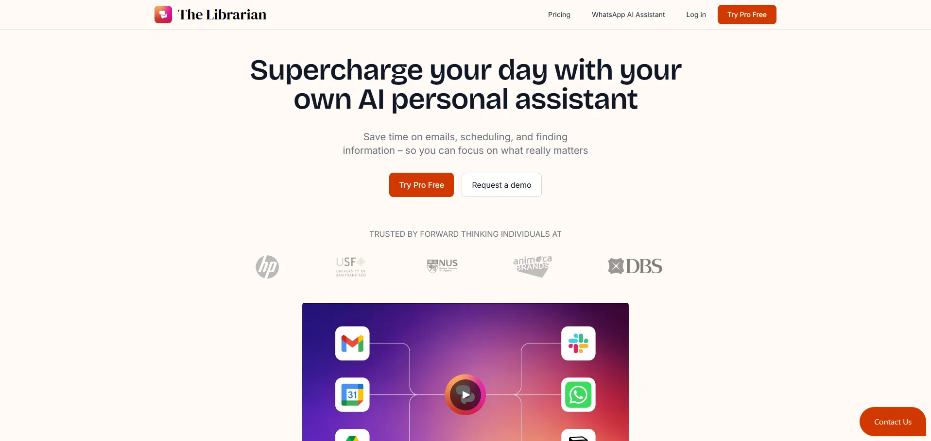 The Librarian es un asistente personal potenciado por IA disponible en WhatsApp, diseñado para profesionales con agendas intensas. Automatiza tareas como la redacción, el resumen y la respuesta de correos electrónicos en segundos, resuelve conflictos de calendario e invita participantes de forma automática gracias a su integración con Google Calendar. Conexión nativa con Gmail, Calendar, Drive, Slack y su propia plataforma web permite localizar documentos en múltiples servicios y aprender tus preferencias con el tiempo. Su cifrado de extremo a extremo asegura la privacidad de tus datos, ofreciendo un entorno seguro y eficiente para optimizar tu productividad diaria.
