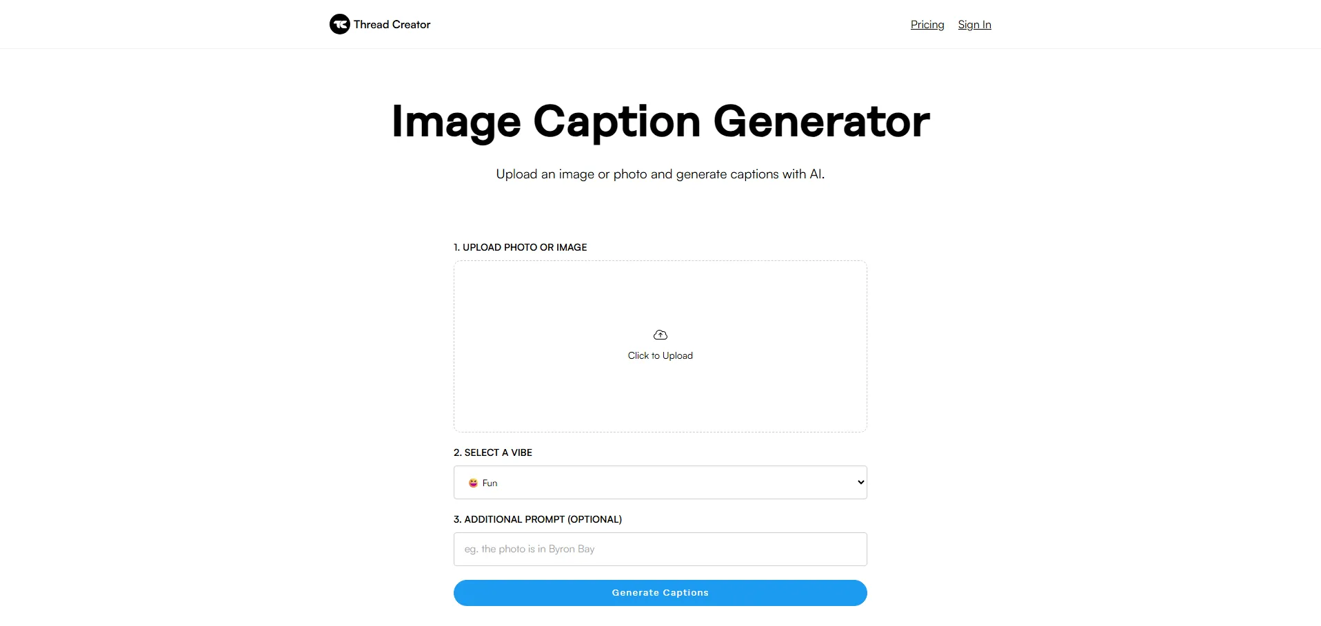 El Generador de Subtítulos para Imágenes de Threadcreator es una herramienta gratuita impulsada por IA que crea captions precisos y creativos a partir de cualquier imagen. Solo subes la foto, eliges el tono (divertido, serio, tierno o genial) y obtienes subtítulos optimizados para redes sociales en pocos segundos. Ideal para ahorrar tiempo y potenciar el engagement de tus publicaciones.