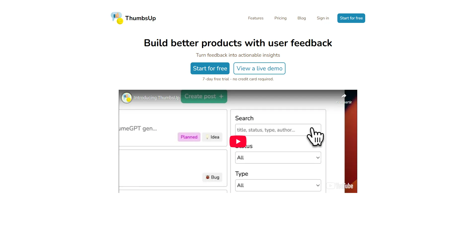 ThumbsUp es una plataforma diseñada para recopilar opiniones de los usuarios y transformarlas en información práctica. Permite crear un espacio dedicado donde los clientes pueden compartir comentarios, reportar errores y expresar agradecimientos, fomentando un ecosistema de retroalimentación dinámico.