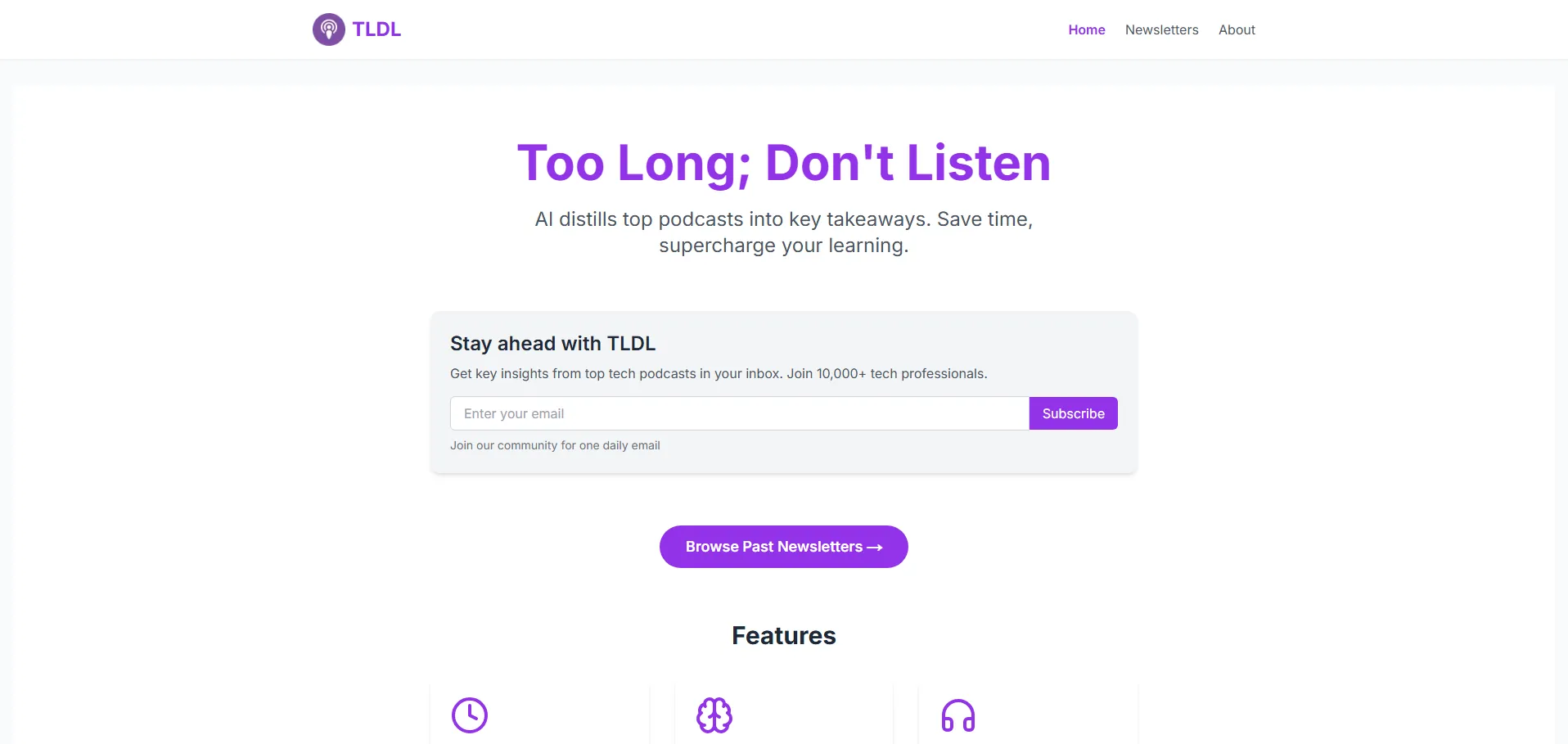 TLDL es una plataforma impulsada por inteligencia artificial que envía resúmenes diarios de los podcasts más relevantes en temas de IA, aprendizaje automático e innovación tecnológica directamente a tu bandeja de entrada. Mediante el análisis automático de transcripciones y la extracción de conclusiones clave, TLDL ahorra tiempo, facilita el aprendizaje continuo y permite acceder a marcas de tiempo específicas para profundizar en los segmentos de interés.