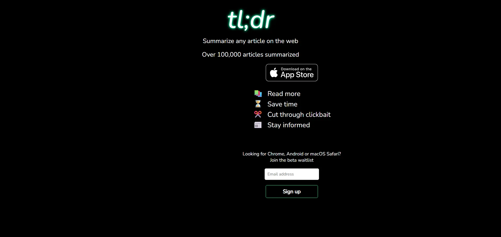tl;dr AI Summarizer es un asistente de lectura impulsado por inteligencia artificial que crea resúmenes instantáneos de artículos web. Con la capacidad de procesar más de 100.000 fuentes, ayuda a los usuarios a filtrar contenido extenso y evitar el clickbait. Compatible con Chrome, Safari, Android y macOS, ofrece acceso a la beta mediante lista de espera para optimizar la experiencia de lectura y ahorrar tiempo.