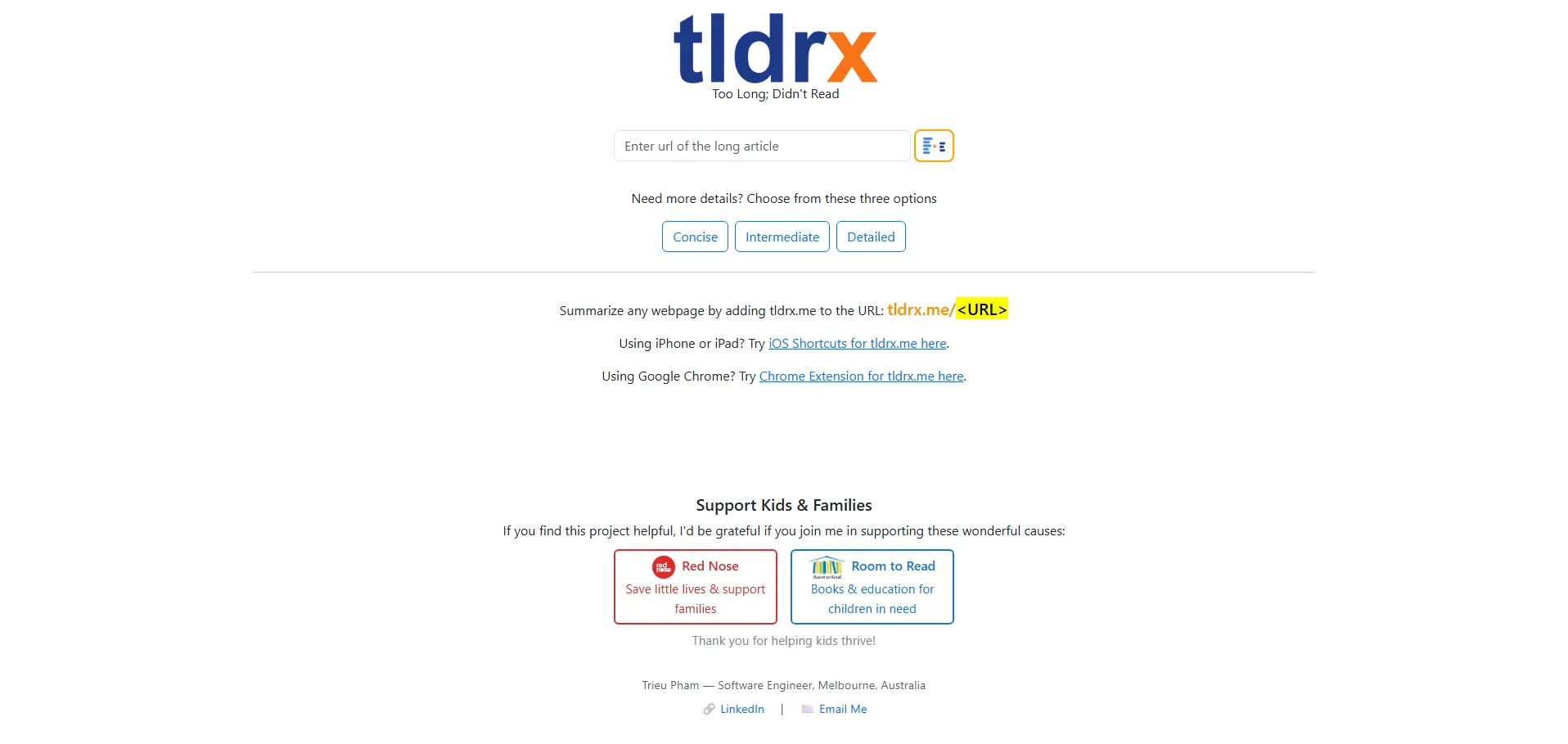 TLDRX es un resumidor de IA que convierte artículos extensos en extractos claros y concisos. Solo tienes que pegar la URL del contenido en tldrx.me y recibirás al instante un resumen de los puntos clave, ahorrando tiempo y focalizándote en lo esencial.