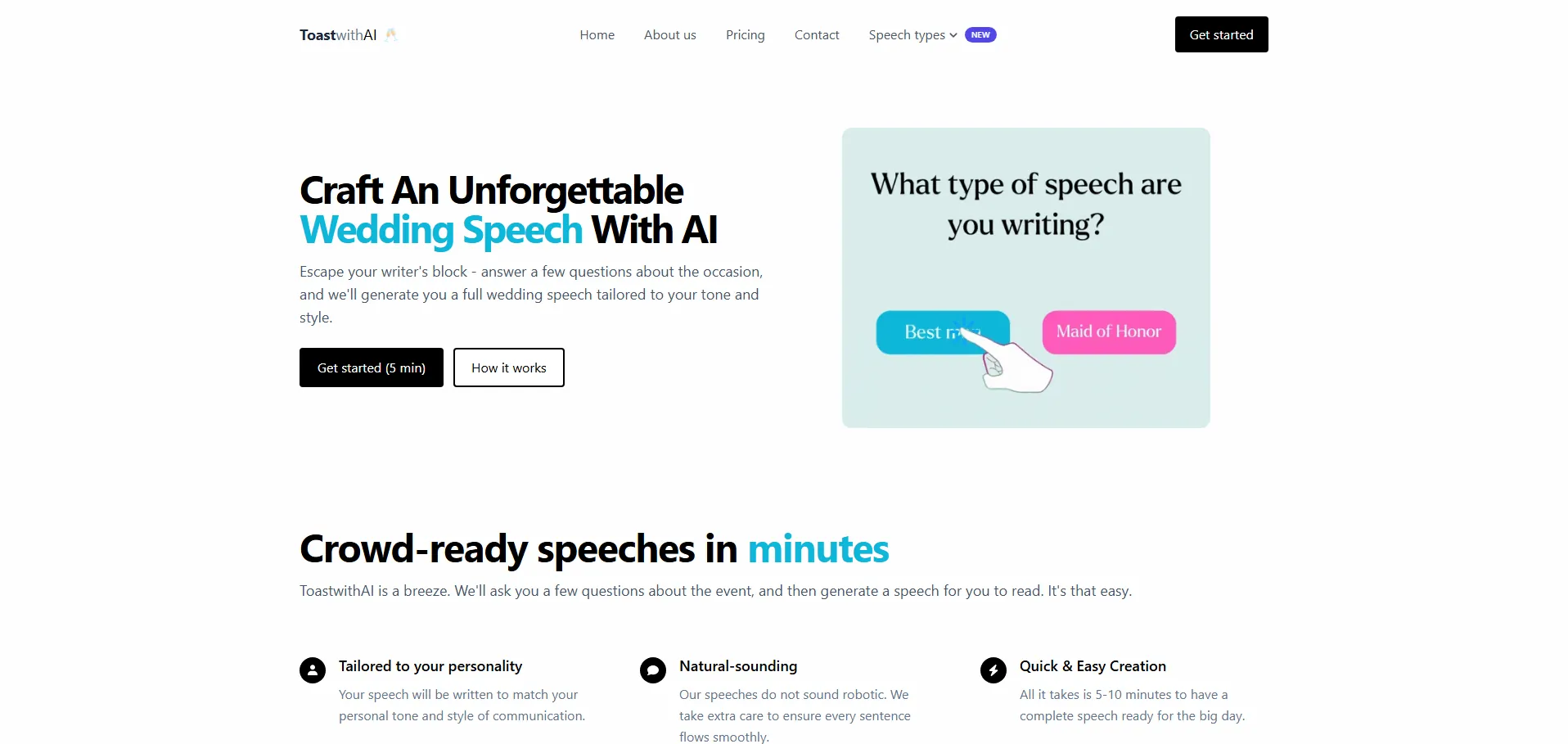 ToastwithAI es una herramienta de inteligencia artificial especializada en la creación de discursos de boda personalizados mediante su módulo Wedding Speech AI. En tres sencillos pasos—responder preguntas sobre el evento, revisar el borrador generado y ajustar el texto con tus comentarios—obtienes un discurso con un tono natural y adaptado a tu estilo. Gracias al modelo avanzado GPT-4, elimina el bloqueo creativo y acelera la redacción, permitiéndote enfocar la emoción y la autenticidad de tu mensaje.