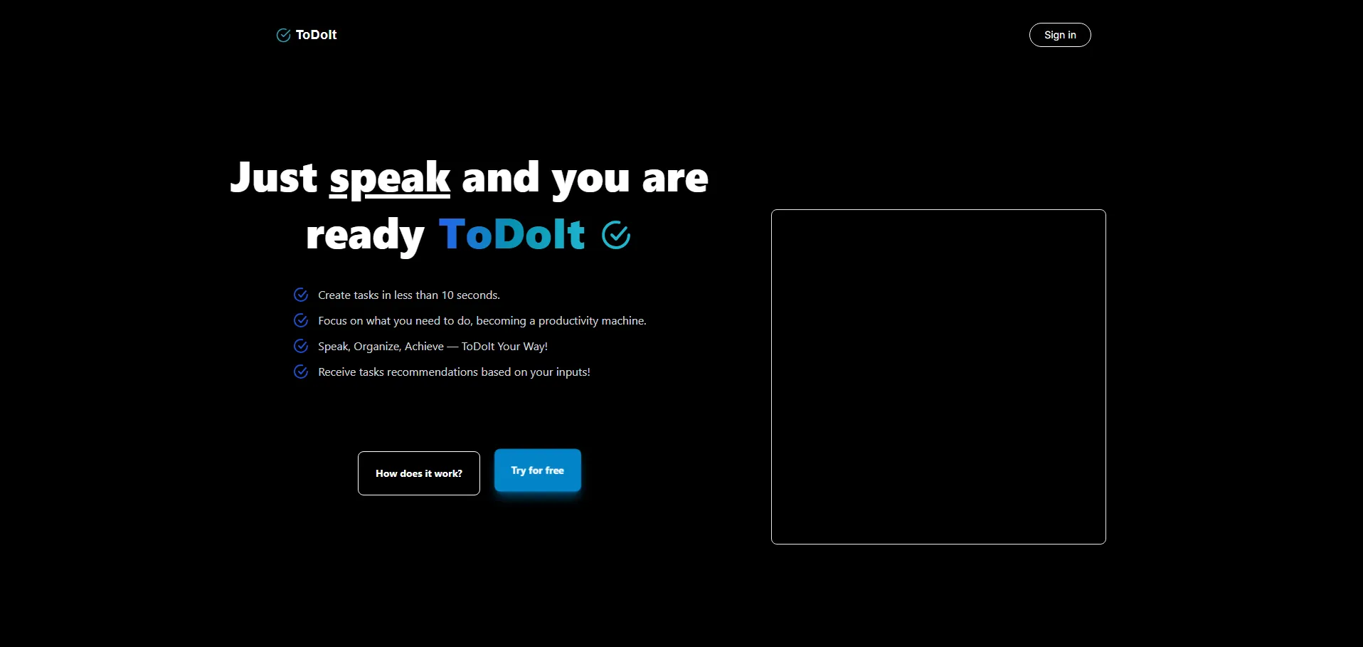 ToDoIt es una aplicación de gestión de tareas potenciada por inteligencia artificial y comandos de voz, diseñada para aumentar la productividad. Mediante reconocimiento de voz en tiempo real y procesamiento de lenguaje natural, permite crear y organizar tareas en segundos sin necesidad de teclear. La plataforma genera listas de tareas personalizadas y ofrece recomendaciones inteligentes basadas en hábitos del usuario. Con soporte en 57 idiomas y eliminación automática de archivos de audio para garantizar la privacidad, ToDoIt ofrece una experiencia segura y ágil para usuarios de todo el mundo.