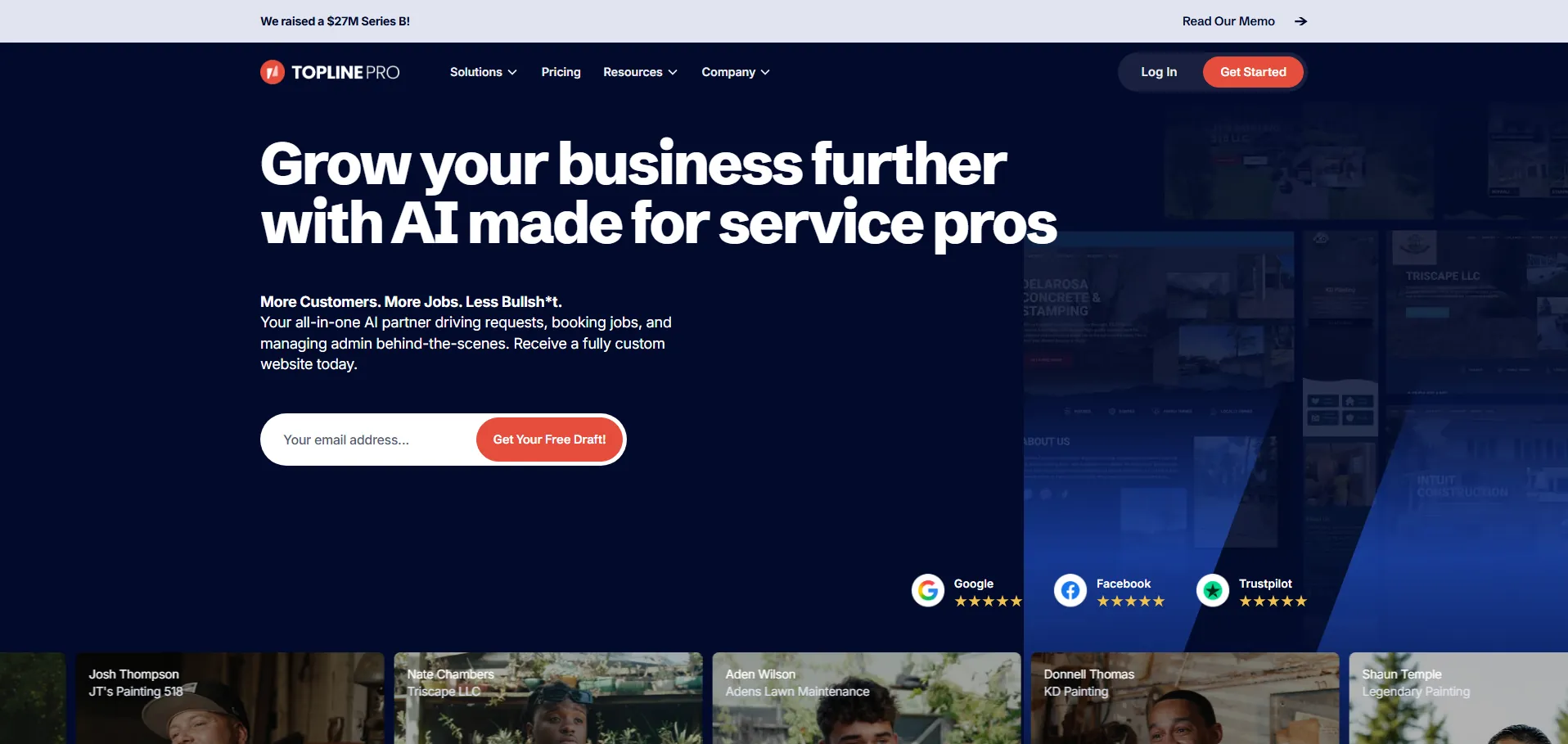 Topline Pro es una plataforma integral de marketing digital diseñada para empresas de servicios para el hogar, como techado, pintura, paisajismo y más. Ofrece un creador de sitios web personalizado con IA, automatización de redes sociales, gestión de reseñas y un sistema de reservas y pagos online, todo optimizado para SEO. Con Topline Pro, las empresas aumentan su visibilidad, generan confianza y convierten visitantes en clientes mediante herramientas automatizadas y un sitio profesional.