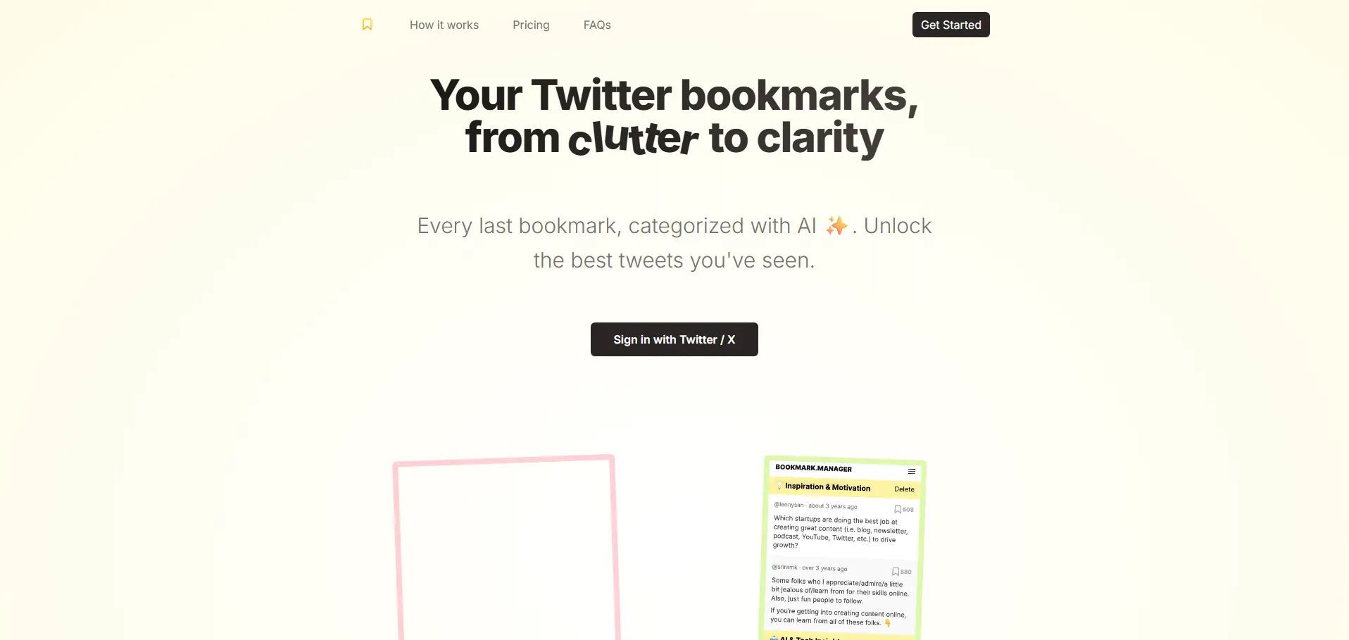 TwitterBookmarks es un gestor de marcadores de Twitter impulsado por IA que organiza automáticamente tus tuits guardados. Utiliza el modelo GPT-4 para categorizar marcadores, ofrece exportaciones masivas en formatos CSV y JSON, y permite gestionar de forma eficaz y encontrar rápidamente el contenido relevante. Con un plan de compra única, proporciona acceso ilimitado para optimizar tu experiencia de marcadores y mantener tu contenido organizado sin esfuerzo.