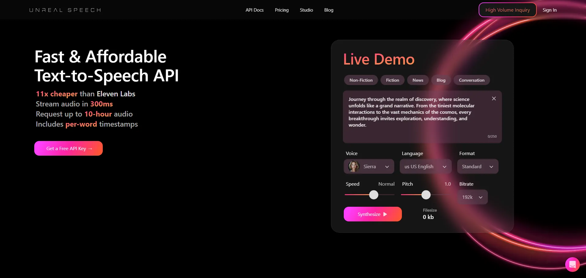 Unreal Speech es una API de texto a voz (TTS) diseñada para ofrecer una solución económica y escalable. Permite convertir texto en audio de alta calidad con una integración sencilla y tiempos de respuesta reducidos, facilitando la automatización de narraciones para distintos proyectos digitales.