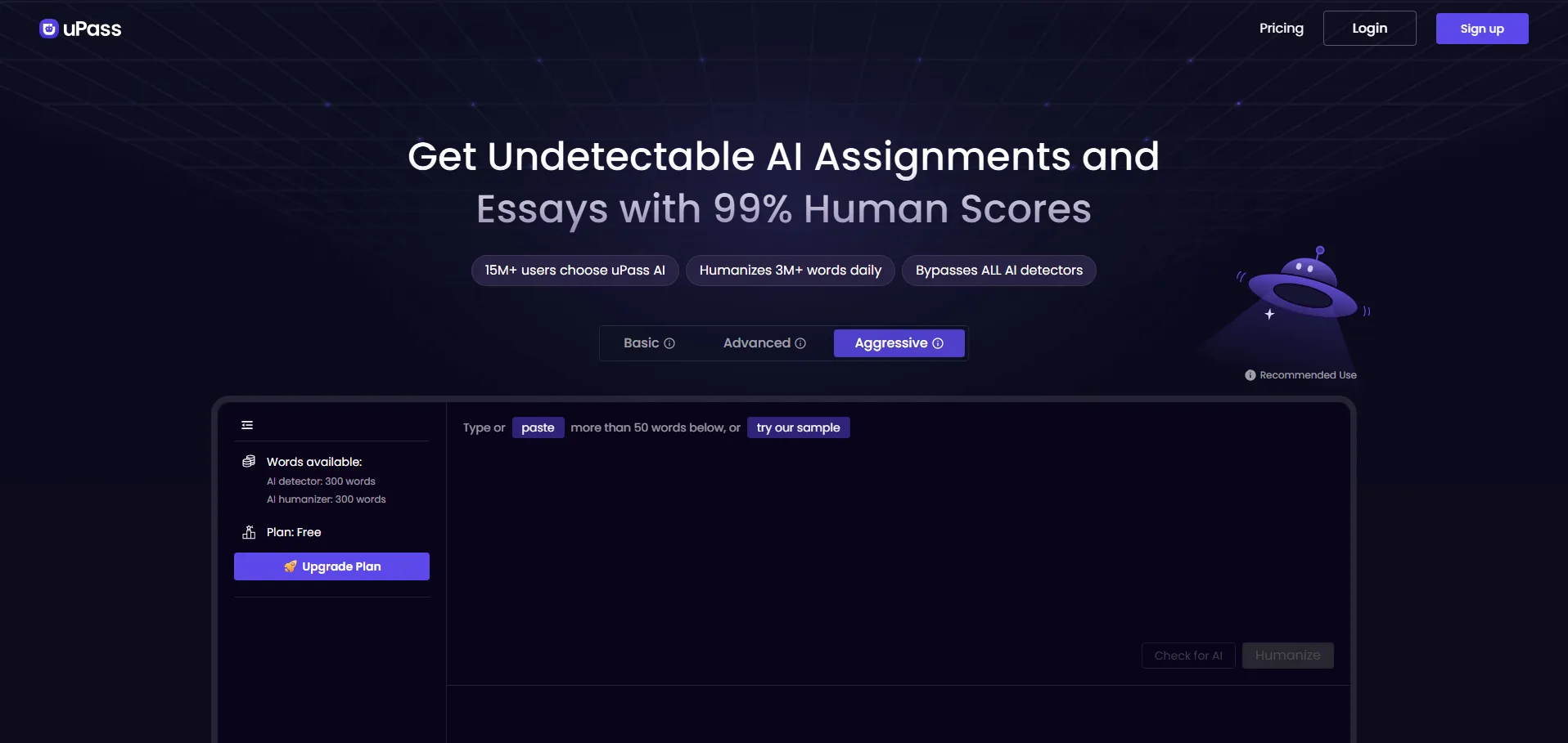 Upass es una herramienta de redacción basada en inteligencia artificial que convierte automáticamente textos generados por IA en contenido indistinguible de la escritura humana. Su interfaz intuitiva permite transformar ensayos, informes y trabajos académicos para minimizar el riesgo de detección por sistemas antiplagio y detectores de IA como Turnitin o Copyleaks. Además, incluye un verificador integrado que analiza tu texto en tiempo real frente a múltiples plataformas de detección.