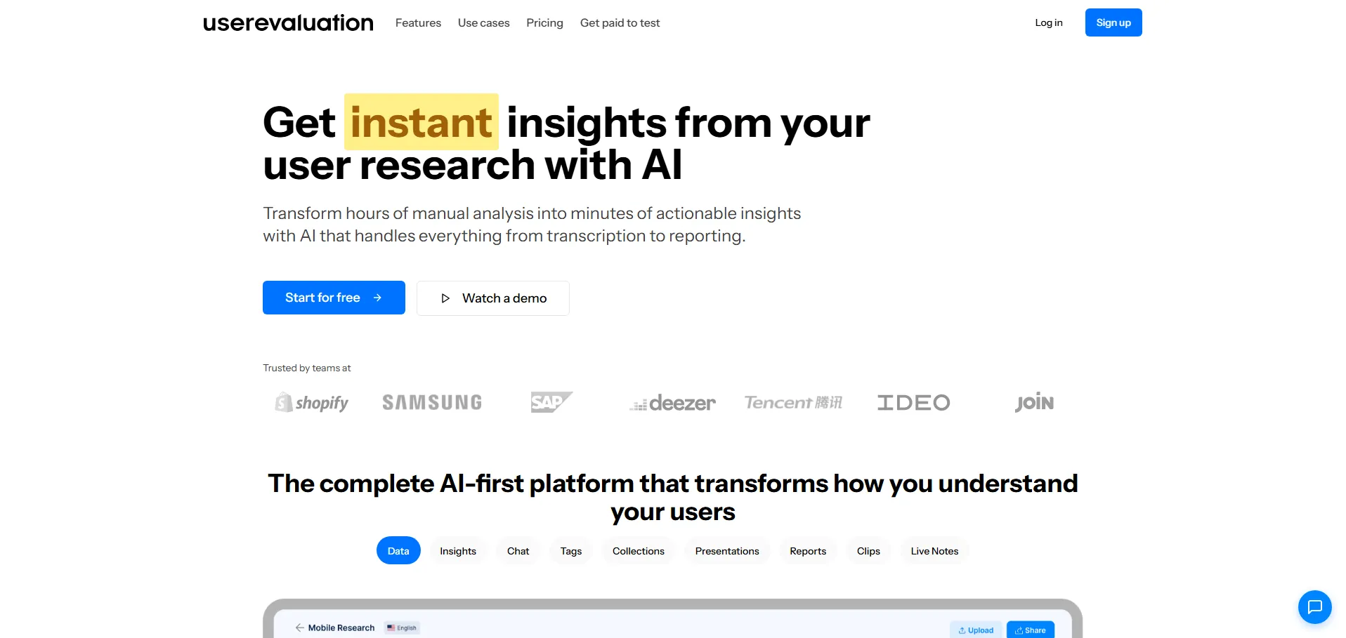 UserEvaluation es una plataforma de investigación de usuarios impulsada por inteligencia artificial. Centraliza el análisis de datos y la extracción de insights para acelerar la creación de informes y la toma de decisiones. Ofrece un entorno intuitivo con chat con IA, videotutoriales y una amplia biblioteca de recursos para optimizar la experiencia de cliente y mejorar productos y servicios.