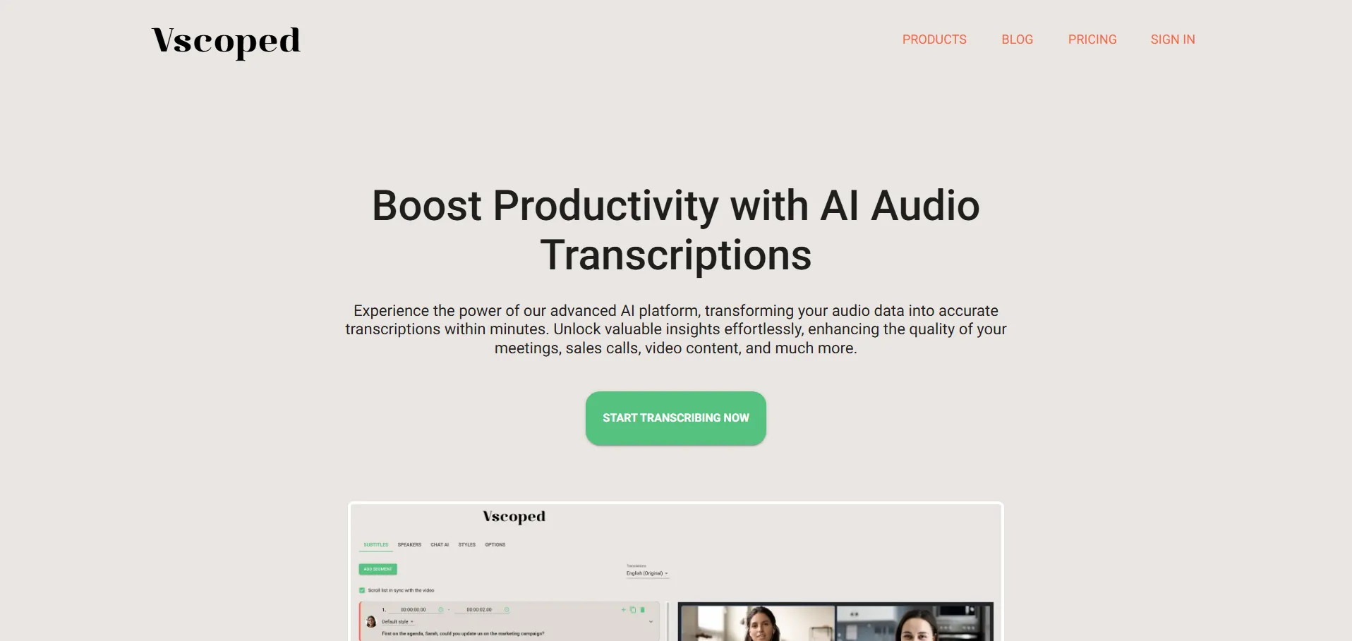 Vscoped es una plataforma de transcripción de video potenciada por inteligencia artificial que convierte pistas de audio en texto con alta precisión y en cuestión de minutos. Admite más de 90 idiomas, lo que permite optimizar reuniones, webinars y llamadas de ventas. Su chat con IA facilita la extracción de ideas clave y la generación de contenido a partir de las transcripciones. Además, integra un servicio de traducción automática para adaptar tu material a audiencias globales y una API para integraciones personalizadas.