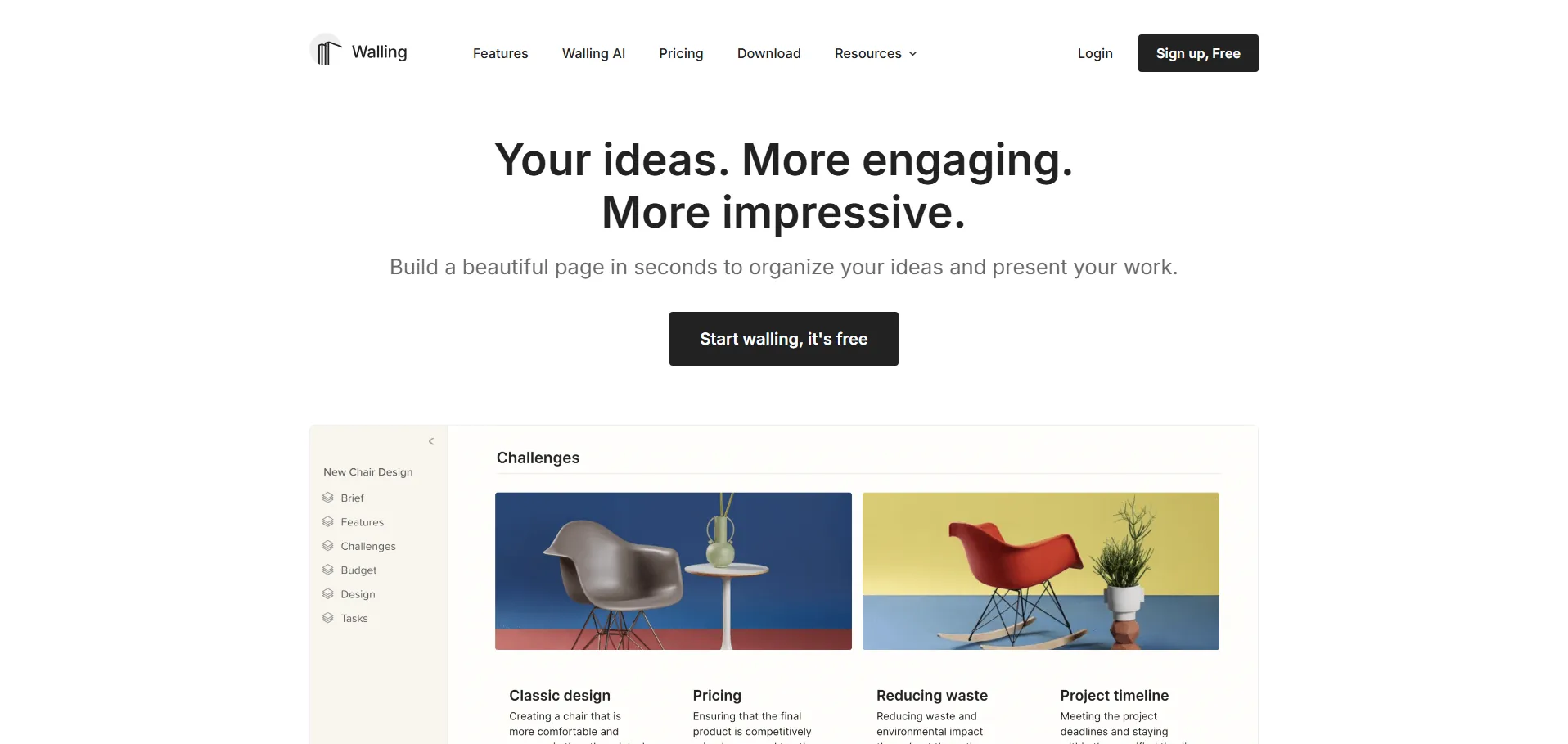 Walling AI es una plataforma impulsada por inteligencia artificial diseñada para organizar, visualizar y presentar ideas de forma impactante. Con tableros flexibles y personalizados, permite crear páginas atractivas, agrupar contenidos y avanzar en proyectos en segundos. Su interfaz admite notas, imágenes, vídeos, archivos, enlaces, tablas y calendarios, consolidando toda la información de un proyecto en un espacio colaborativo y visual.