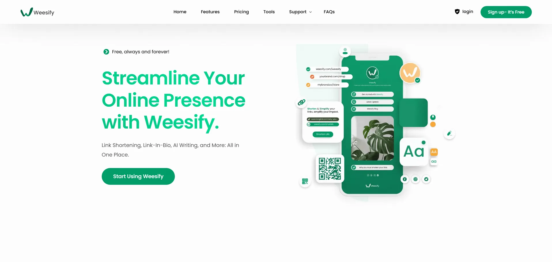 Weesify es una plataforma integral impulsada por inteligencia artificial que optimiza tu presencia digital desde un único panel de control. Con funciones avanzadas de acortamiento de enlaces, creación de bioenlaces personalizables, redacción y generación de imágenes con IA, además de códigos QR dinámicos, Weesify te permite gestionar, medir y potenciar cada vínculo que compartes. Su acceso a más de 140 herramientas web, junto con análisis en tiempo real e integración directa con redes sociales, acelera tu estrategia online y mejora la experiencia de tu audiencia.