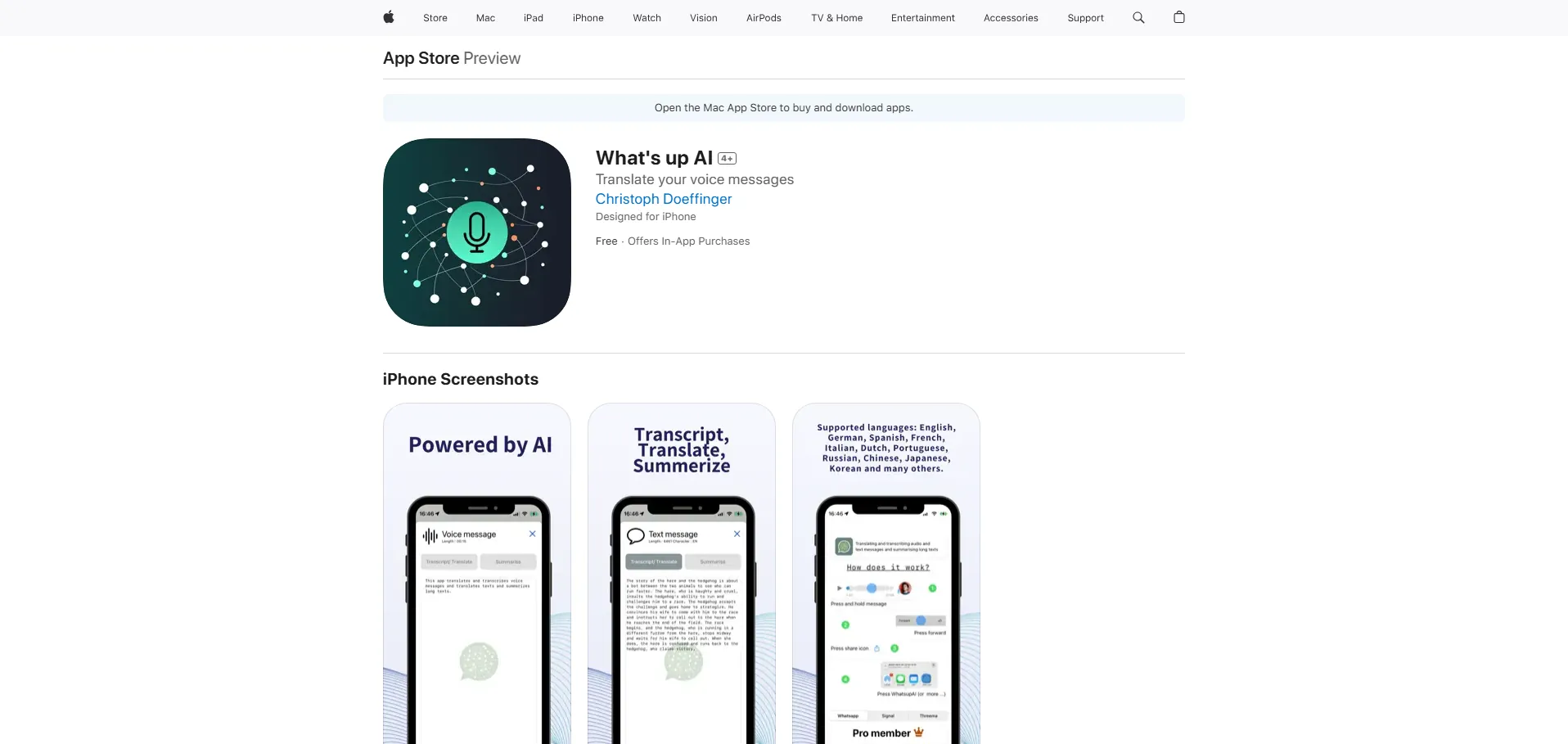 What’s Up AI es una aplicación impulsada por inteligencia artificial que transcribe y traduce mensajes de voz de WhatsApp, Signal, Threema y Telegram en texto claro. Incluye una función de resumen que condensa audios largos en breves párrafos con la información esencial. Su integración nativa con WhatsApp permite ver y responder al instante, incluso en entornos ruidosos o cuando no hay tiempo para escuchar. Compatible con más de 30 idiomas, elimina las barreras lingüísticas y mejora la comunicación global.