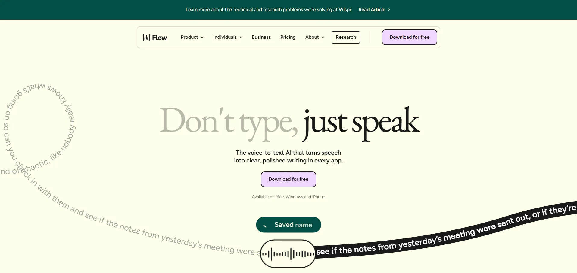 Wispr Flow es una herramienta de dictado por voz potenciada por IA que permite escribir hasta tres veces más rápido en cualquier aplicación. Con reconocimiento contextual avanzado y soporte para más de 100 idiomas, ofrece autocorrección en tiempo real y sugerencias inteligentes. Su modo de comando con IA facilita el control de documentos sin teclear, mientras que el modo susurro garantiza discreción en entornos silenciosos. Ideal para articular ideas de forma natural y fluida, Wispr Flow optimiza la productividad y mejora la experiencia de dictado.