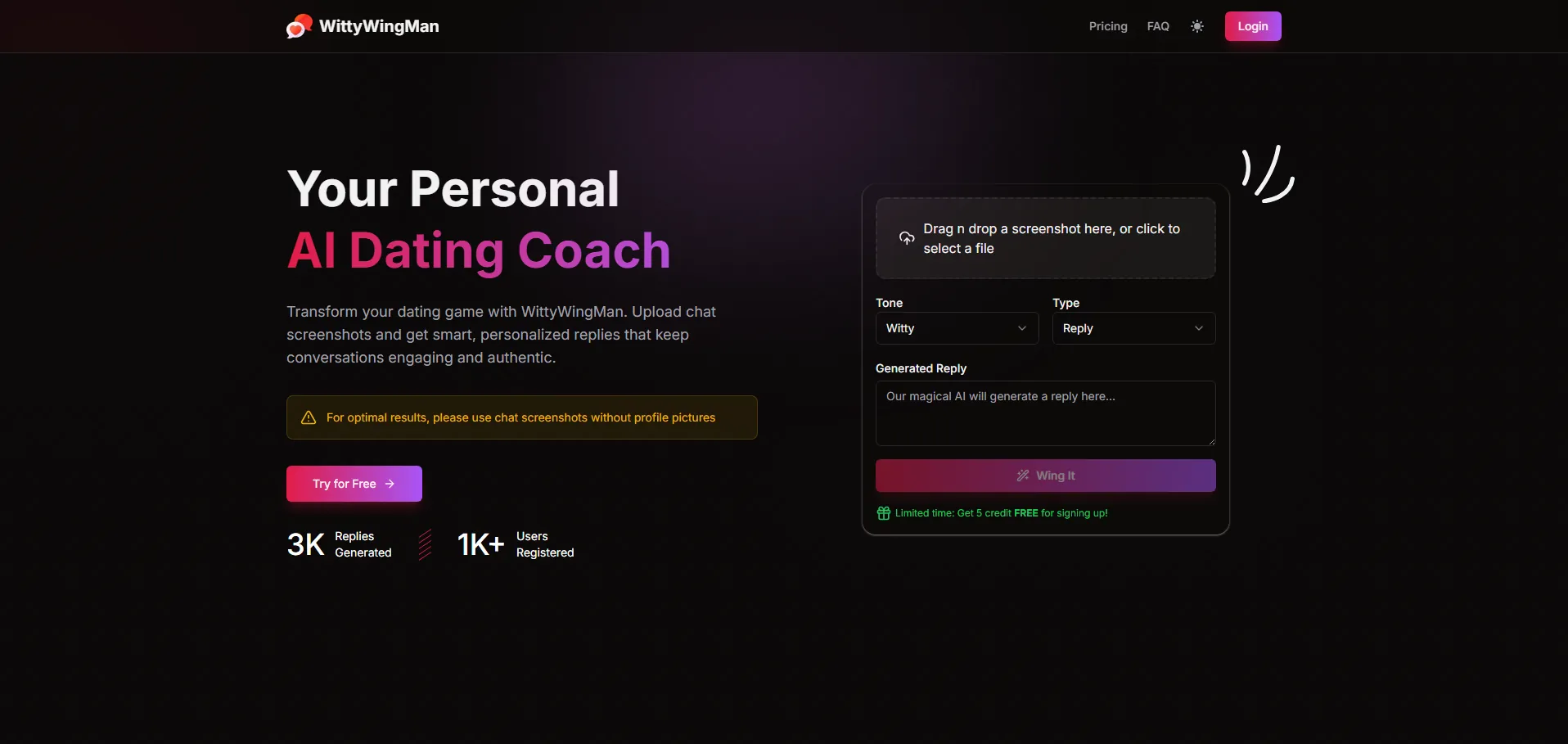 WittyWingman es un asistente de chat con IA especializado en conversaciones de citas en línea. Permite subir capturas de pantalla del chat mediante arrastrar y soltar, generando respuestas personalizadas y contextuales que reflejan tu estilo y añaden un toque de ingenio. Gracias a su aprendizaje automático adaptativo, la herramienta mejora con cada interacción, mientras su soporte multilingüe facilita conectar con matches de diferentes idiomas. Su interfaz intuitiva y su enfoque en la privacidad garantizan una experiencia de chat segura, discreta y eficiente.
