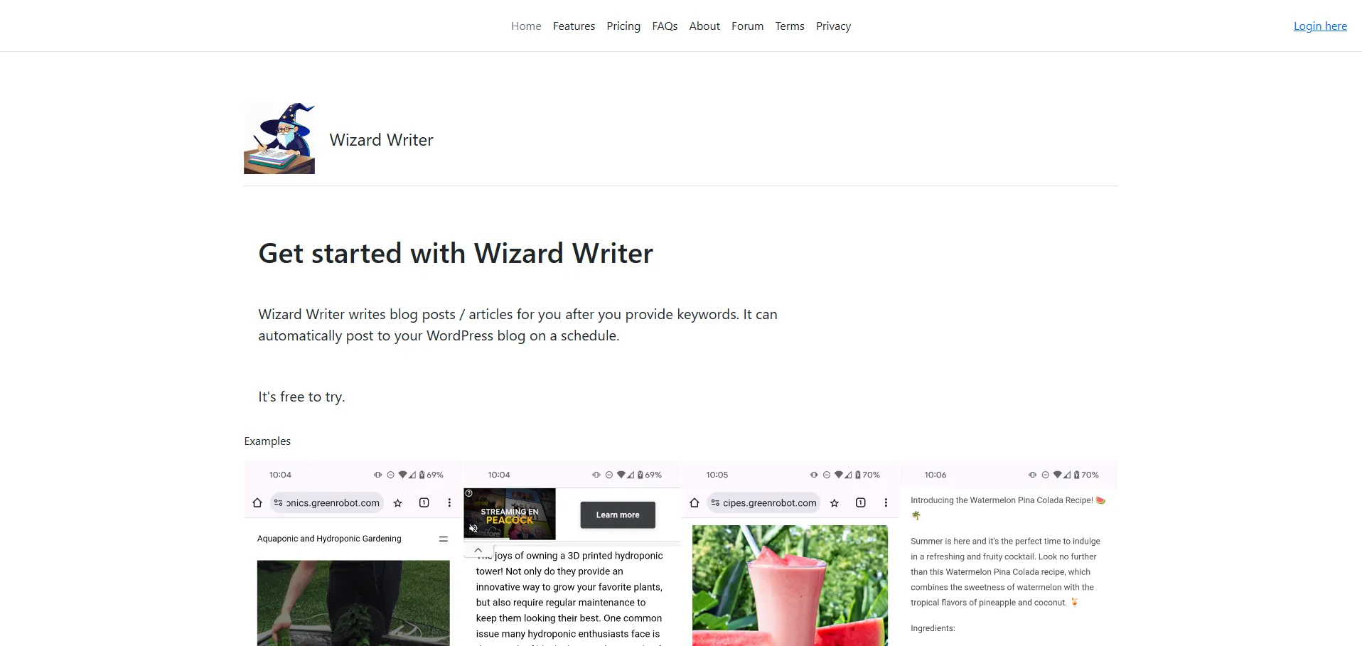 Visita el sitio oficial de Wizard Writer para explorar tutoriales, API de integración y documentación detallada. Accede a guías paso a paso y ejemplos prácticos para maximizar el rendimiento SEO de tu blog.