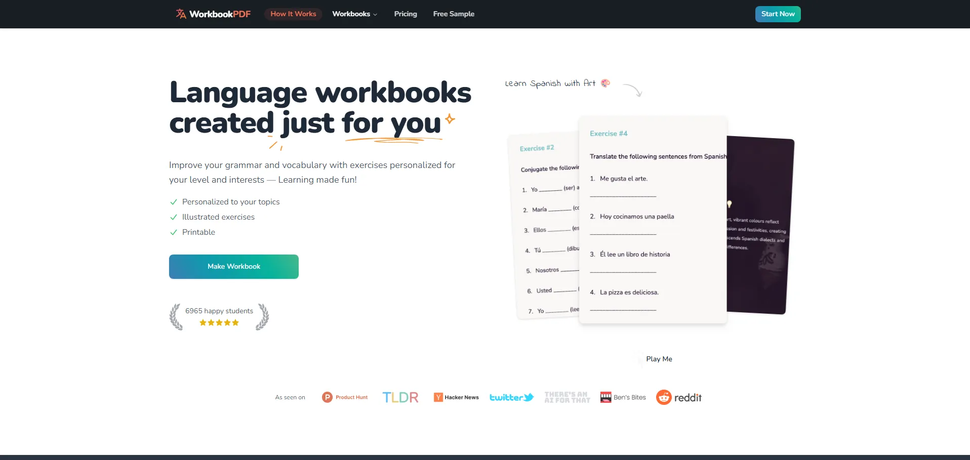 WorkbookPDF es una plataforma basada en inteligencia artificial que permite generar cuadernos de idiomas personalizados según el nivel y los intereses de cada usuario. Soporta 23 idiomas y crea ejercicios en formatos como completar espacios, opción múltiple y traducción. Cada cuaderno incluye respuestas para la autoevaluación, opciones de impresión y herramientas colaborativas para compartir materiales entre compañeros, facilitando el aprendizaje tanto online como offline.