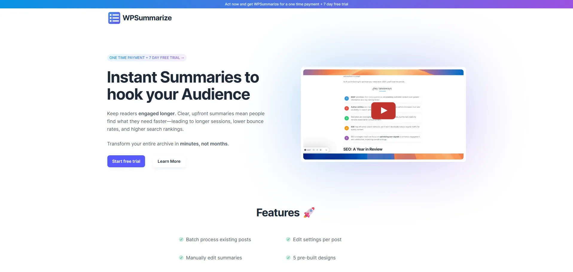 WPSummarize es un plugin de WordPress que automatiza la generación de resúmenes concisos de entradas de blog, mejorando la experiencia del usuario y el rendimiento del sitio. Con procesamiento por lotes de publicaciones y cinco diseños personalizables, permite destacar lo esencial sin saturar al lector. Su compatibilidad con los principales creadores de páginas y tipos de entradas personalizadas ofrece gran flexibilidad, mientras que su enfoque en optimización SEO incrementa la visibilidad en buscadores al presentar extractos claros y relevantes.