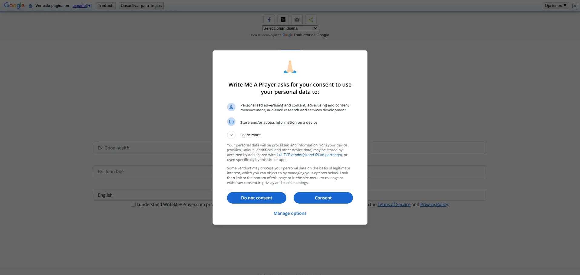 Escríbeme una Oración es un generador de oraciones impulsado por inteligencia artificial que crea plegarias y textos espirituales personalizados en más de diez idiomas, como inglés, español, francés y alemán. Gracias a su tecnología IA de última generación, permite seleccionar temas específicos —intervención divina, restauración, gratitud o guía— y accede a oraciones compartidas por una comunidad global para inspirar conexión y apoyo mutuo.