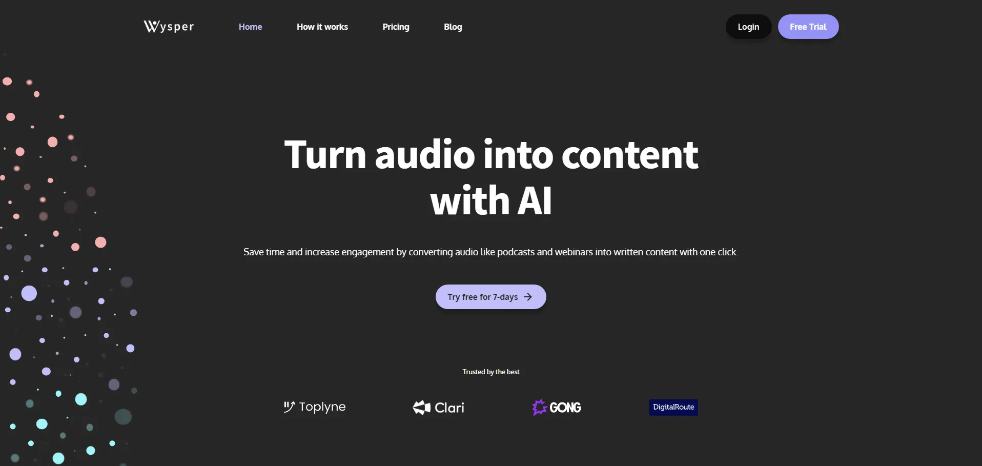 Wysper es una solución de inteligencia artificial que convierte grabaciones de audio—como podcasts, webinars y entrevistas—en contenido escrito optimizado con un solo clic. Genera transcripciones detalladas, resúmenes, notas de presentación y marcas de tiempo con un 99 % de precisión, y traduce tu material a más de 95 idiomas. Ahorra tiempo en postproducción y amplía tu alcance global creando contenido listo para blogs, redes sociales y newsletters.