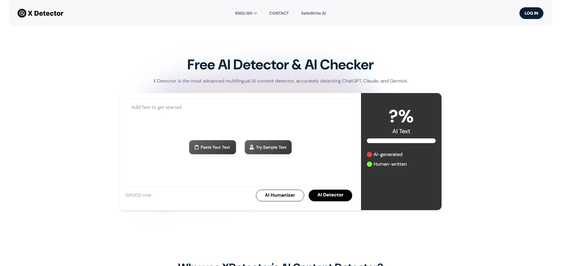 X Detector es una herramienta avanzada de detección de contenido generada por inteligencia artificial. Gracias a sus algoritmos entrenados con más de 10 000 millones de muestras, identifica con precisión textos creados por modelos como ChatGPT, Claude o Gemini en más de 20 idiomas. Su tecnología de cifrado Web3 garantiza la seguridad de los datos y evita duplicaciones y fugas, mientras que su interfaz intuitiva ofrece resultados en segundos para mejorar la eficiencia de tus procesos de verificación.