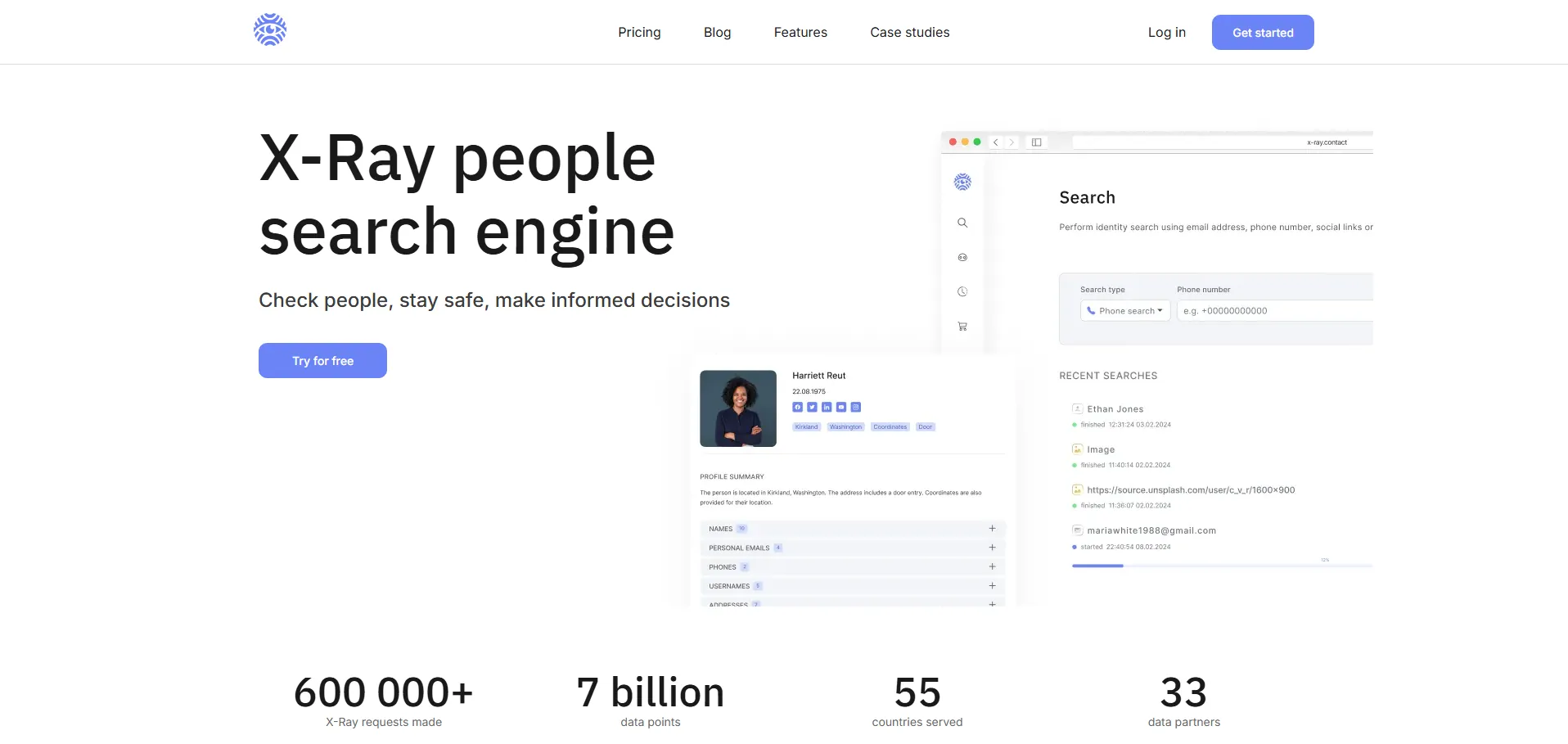 X-Ray Contact es una plataforma de búsqueda de personas en línea que recopila y centraliza datos de múltiples fuentes en perfiles unificados. Emplea algoritmos avanzados y funciones de búsqueda integral para ofrecer información completa sobre la identidad digital de individuos: nombre, direcciones, perfiles sociales y contactos de trabajo o personales. Con X-Ray Contact, los usuarios agilizan investigaciones, verifican antecedentes y descubren correos electrónicos y números de teléfono para facilitar el contacto eficaz.